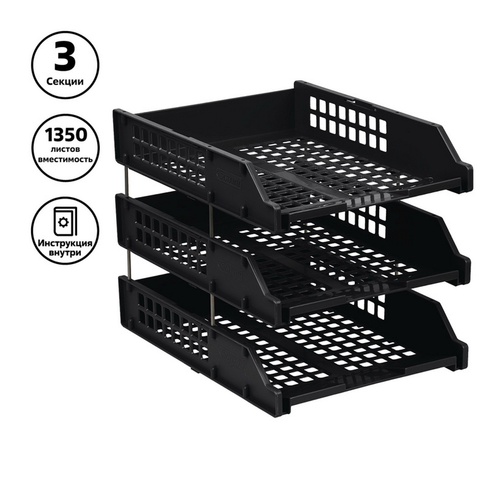 Три уровня организации Используйте каждый лоток для определённого этапа работы: например, верхний для входящих документов, средний для материалов в процессе, нижний для готовых к архивированию. Такая система обеспечивает логичный поток документов и избавляет от хаотичных стопок на столе. Это решение для тех, кто ценит порядок, надёжность и визуальную целостность на рабочем месте. | ||