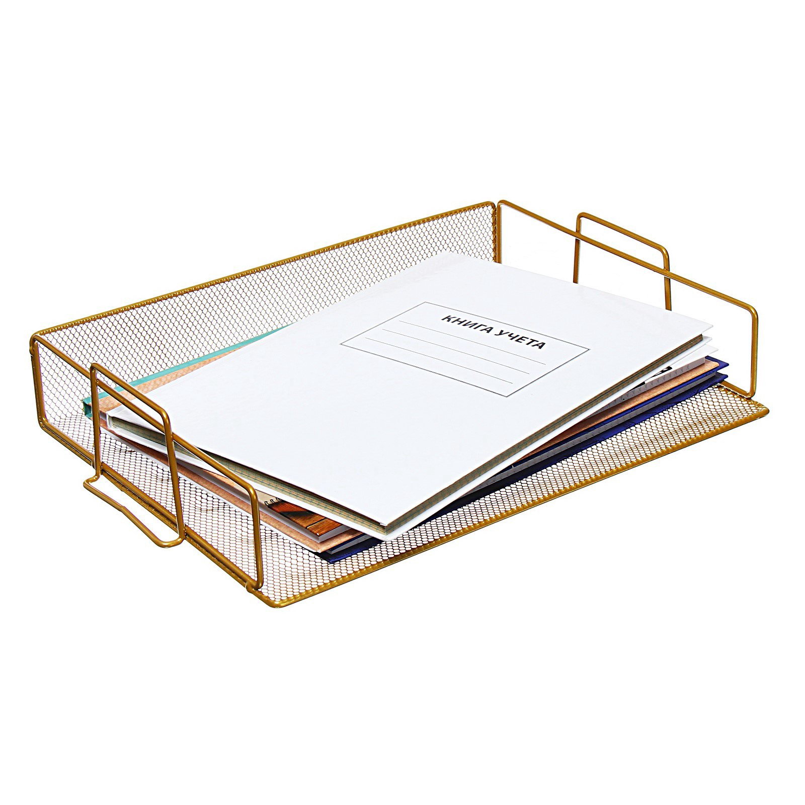 Золотистая горизонтальная лоток-сетка станет стильным акцентом в вашем рабочем пространстве. Этот металлический помощник сохраняет порядок на столе, позволяя вам сосредоточиться на важных задачах. Простой, но элегантный дизайн подходит для любого интерьера и придаёт вашему офису утончённый вид. Основные преимущества
