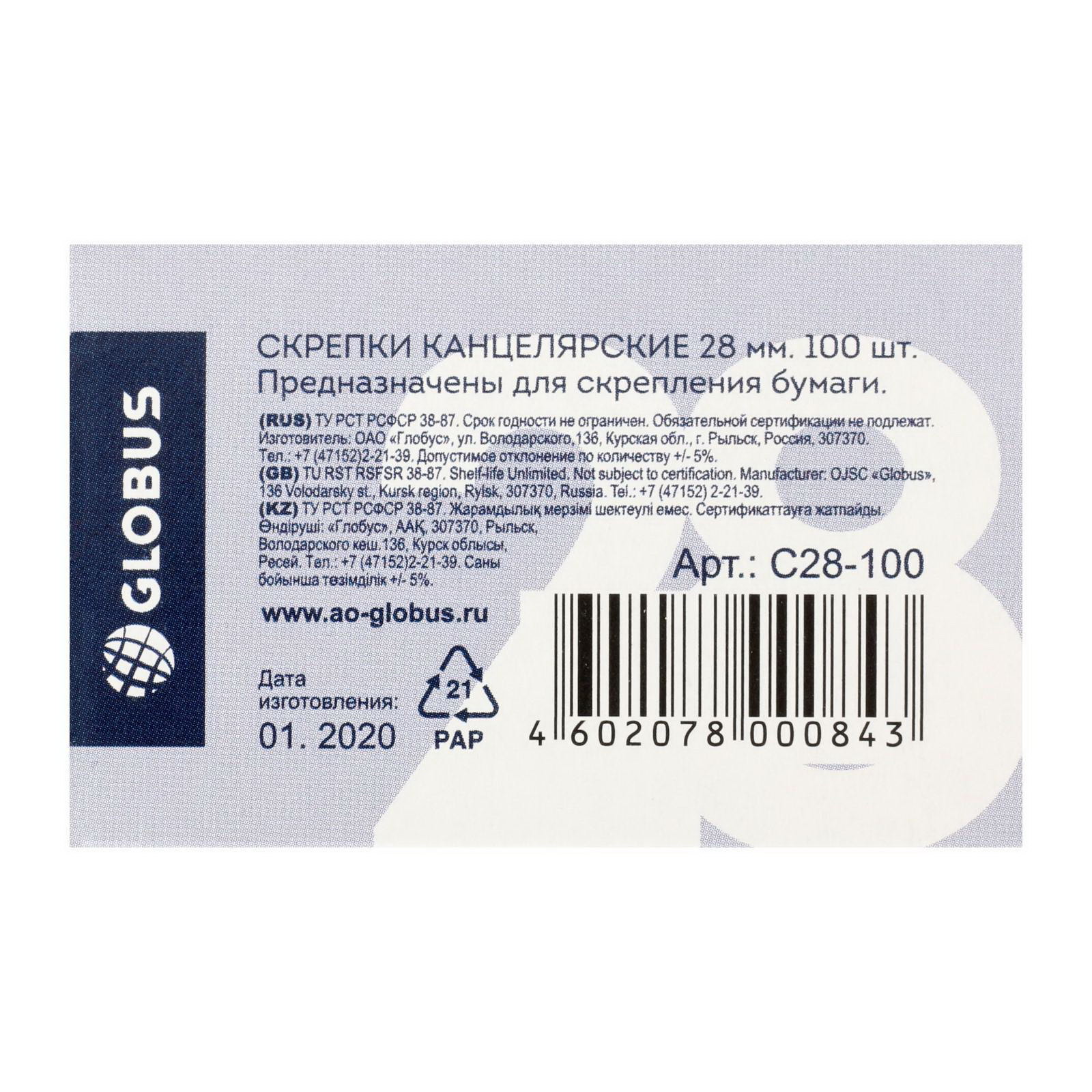 Скрепки канцелярские 28 мм, 100 шт., без покрытия, GLOBUS, Россия