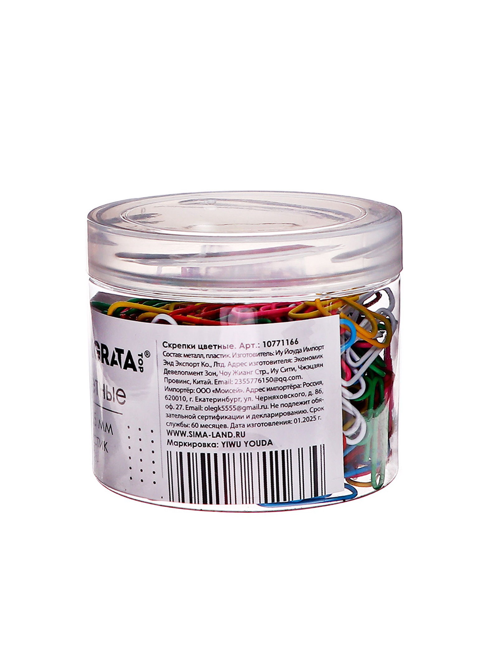Размер упаковки: 6 x 7 x 7 см. Европодвес: Нет В упаковке, шт.: 300 Цвет: Разноцветный Вид упаковки: Пластиковая банка Форма: Круглые Длина скрепки: 25 Покрытие скрепки: Пластиковое Штрихкод на единице товара: Да tnved: 8305200000 tnved: 8305200000 Представьте себе идеальное решение для вашей канцелярии – цветные скрепки в тубе. Эти канцелярские помощники добавят яркие акценты в ваш рабочий день и помогут с лёгкостью организовать любые документы. Не просто скрепки, а истинные мастера порядка в вашем офисном мире. Преимущества