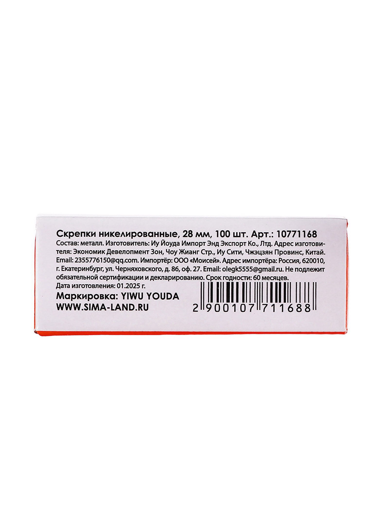 Скрепки 28 мм никелированные в картонной коробке 100 штук, 5x4x2.5 см., Calligrata, Китай