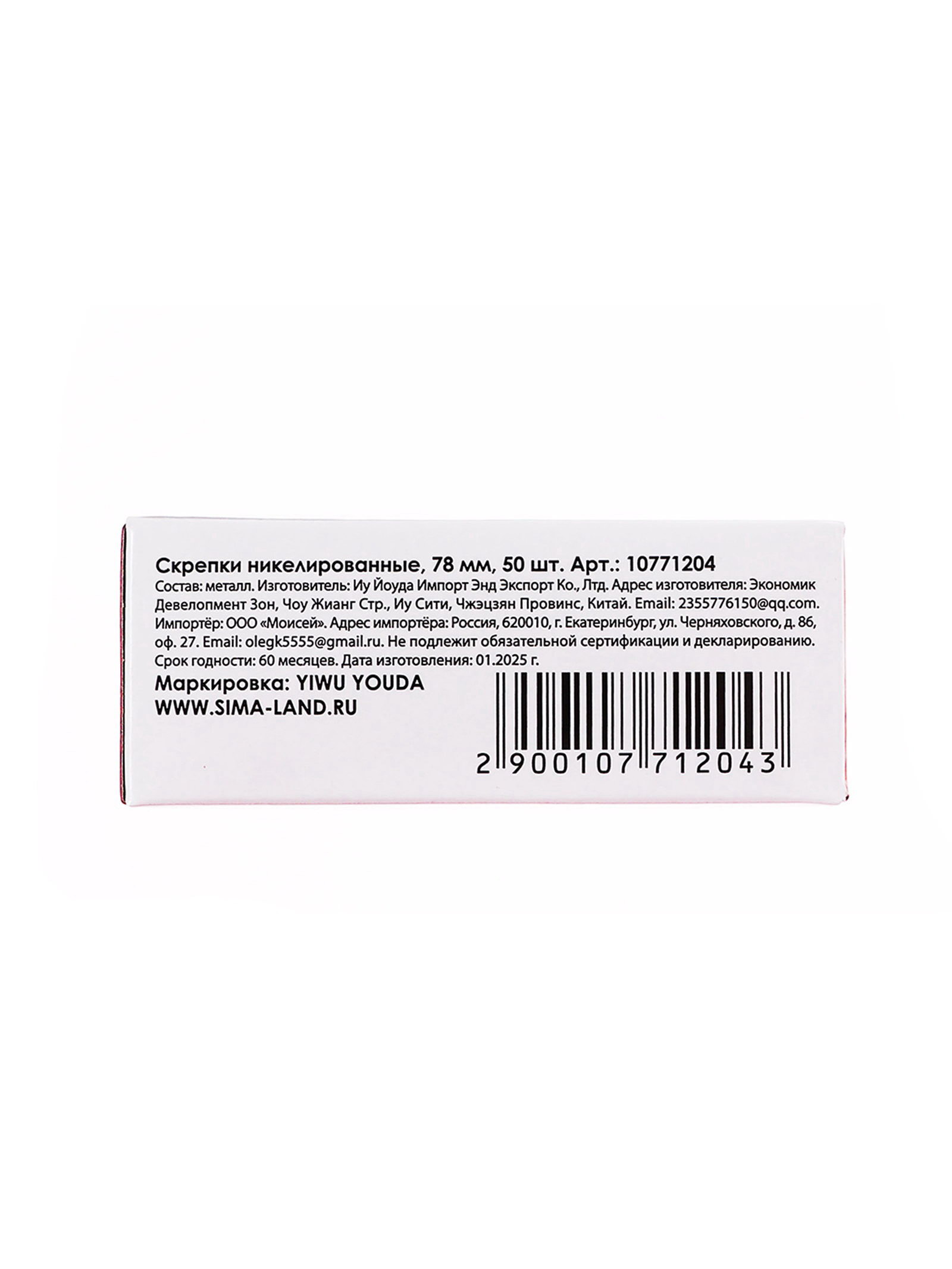 Скрепки 78 мм никелированные в картонной коробке 50 штук, 5x4x2.5 см., Calligrata, Китай