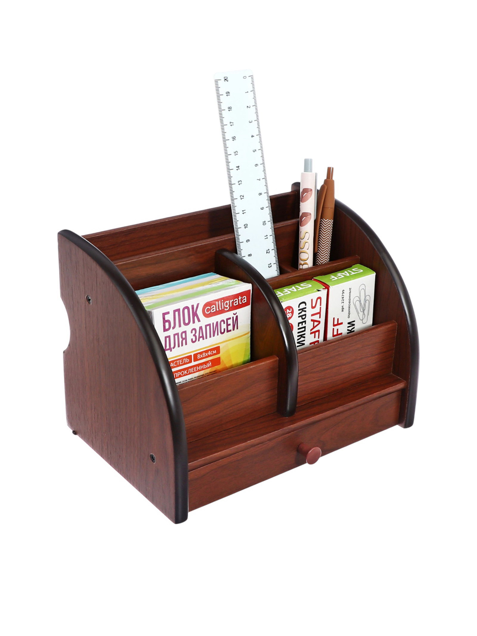 Преимущества использования Этот органайзер помогает структурировать рабочее пространство, предотвращая беспорядок. Отделения позволяют быстро находить нужные канцелярские принадлежности, а выдвижной ящик хранить важные мелочи. Такой подход способствует повышению эффективности работы и удобству хранения документов и предметов. Почему выбирают этот продукт Дерево создает ощущение надежности и экологической чистоты. Простая конструкция делает его универсальным дополнением к любому интерьеру. Он отлично подойдет для тех, кто ценит порядок, практичность и аккуратность в организации рабочего пространства или домашнего офиса. Если важна аккуратность и удобство хранения, этот подставка-органайзер станет надежным помощником. Он поможет держать все необходимые предметы под рукой и сохранять чистоту на рабочем месте или в учебной зоне. | ||