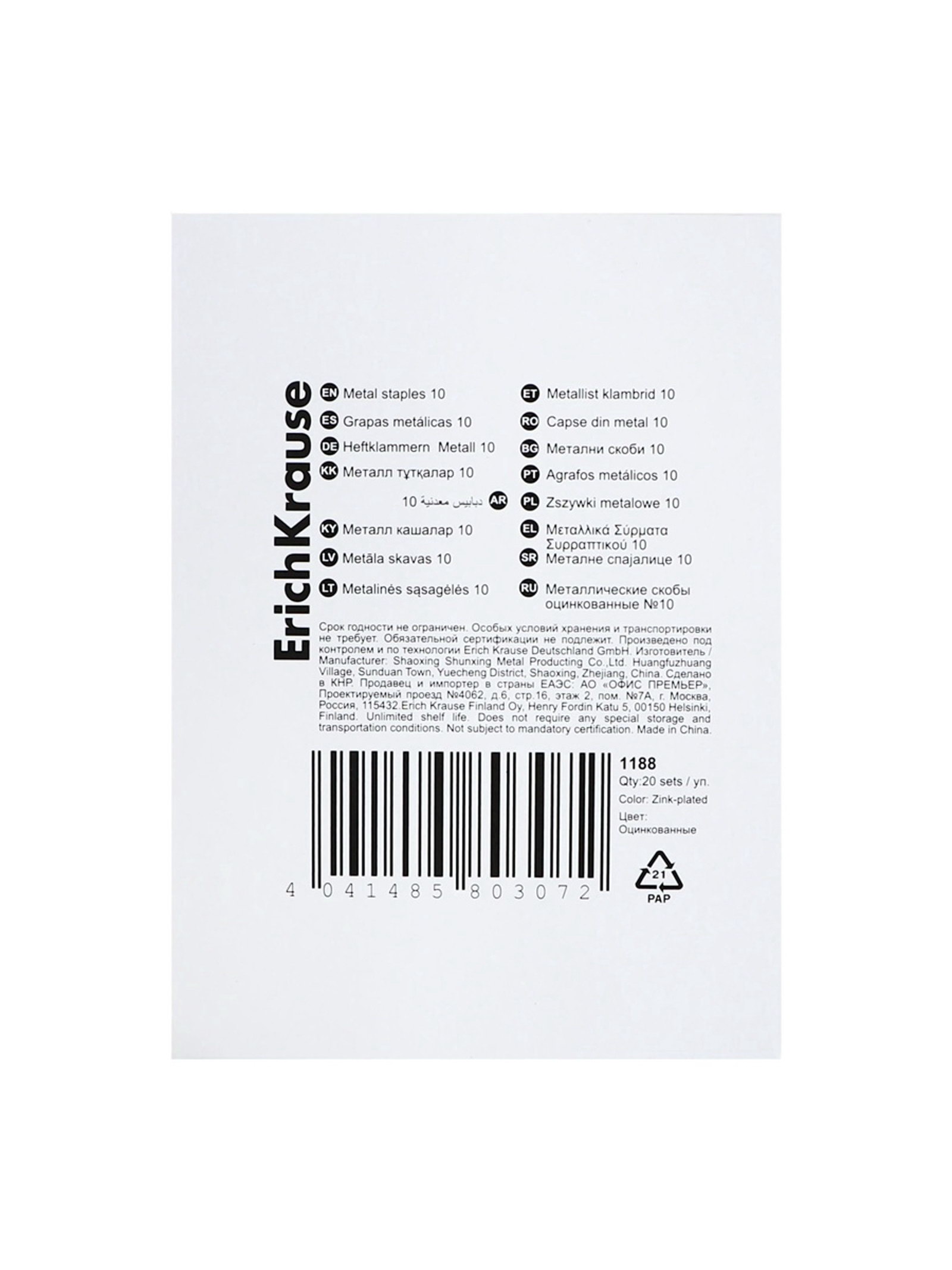Скобы металлические №10, для степлера, 1000 шт., 5x1x3 см., ErichKrause, Китай