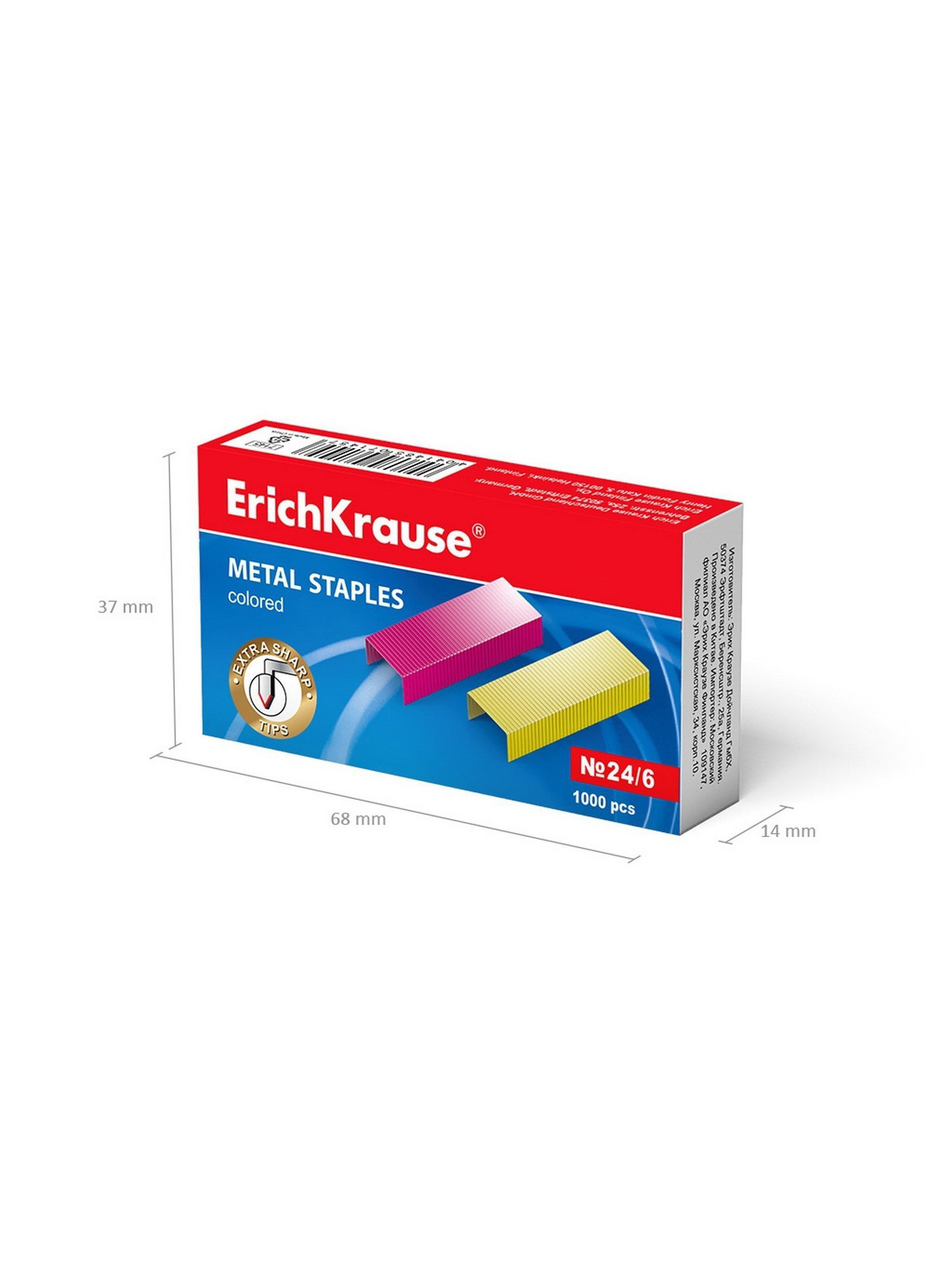 Скобы металлические №24/6, для степлера 1000 шт., цветные, 3.8x6.8x1.5 см., ErichKrause, Китай