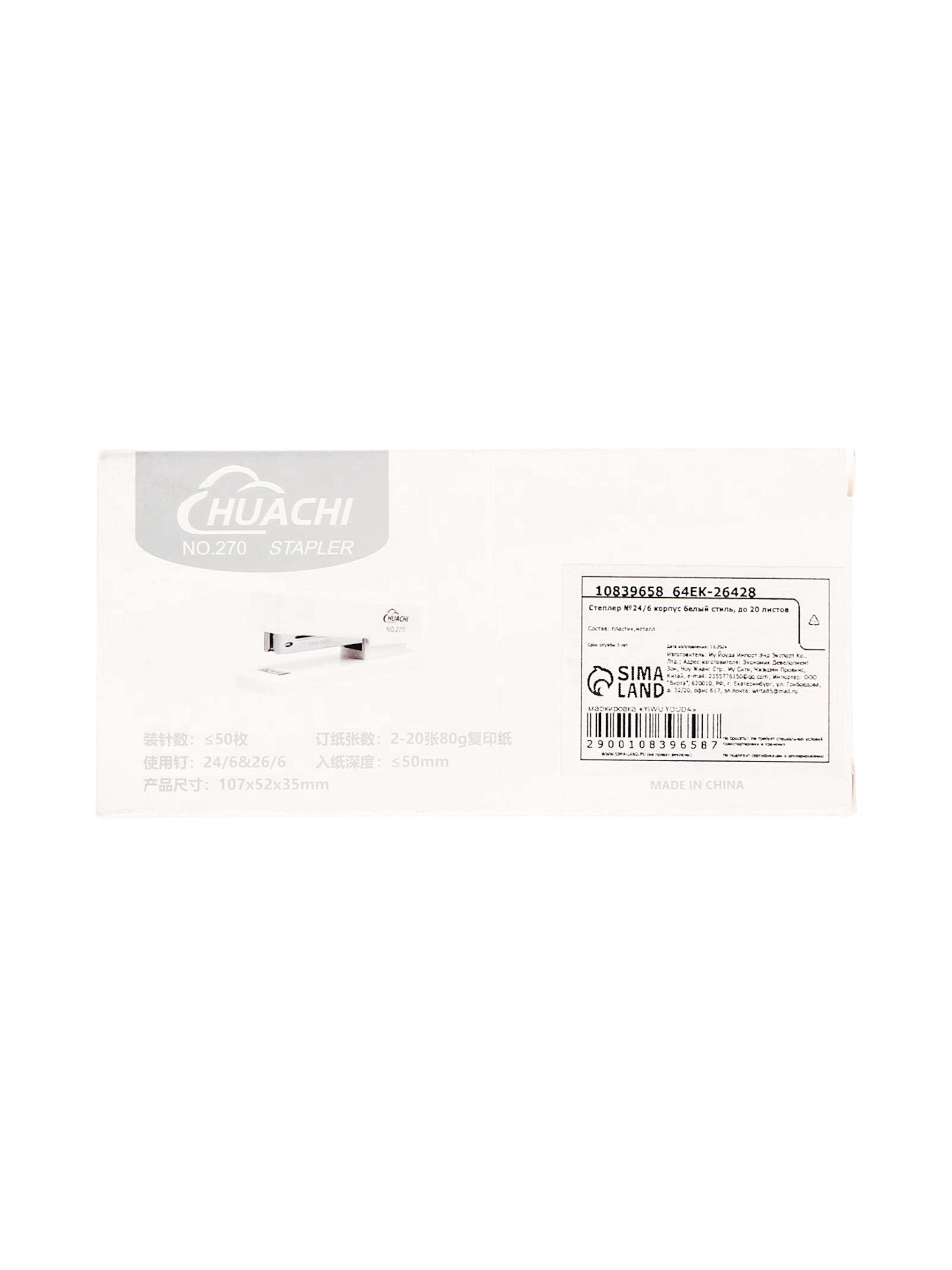 Степлер №24/6 корпус белый стиль, до 20 листов, 3.3x10.4x3.3 см., Китай
