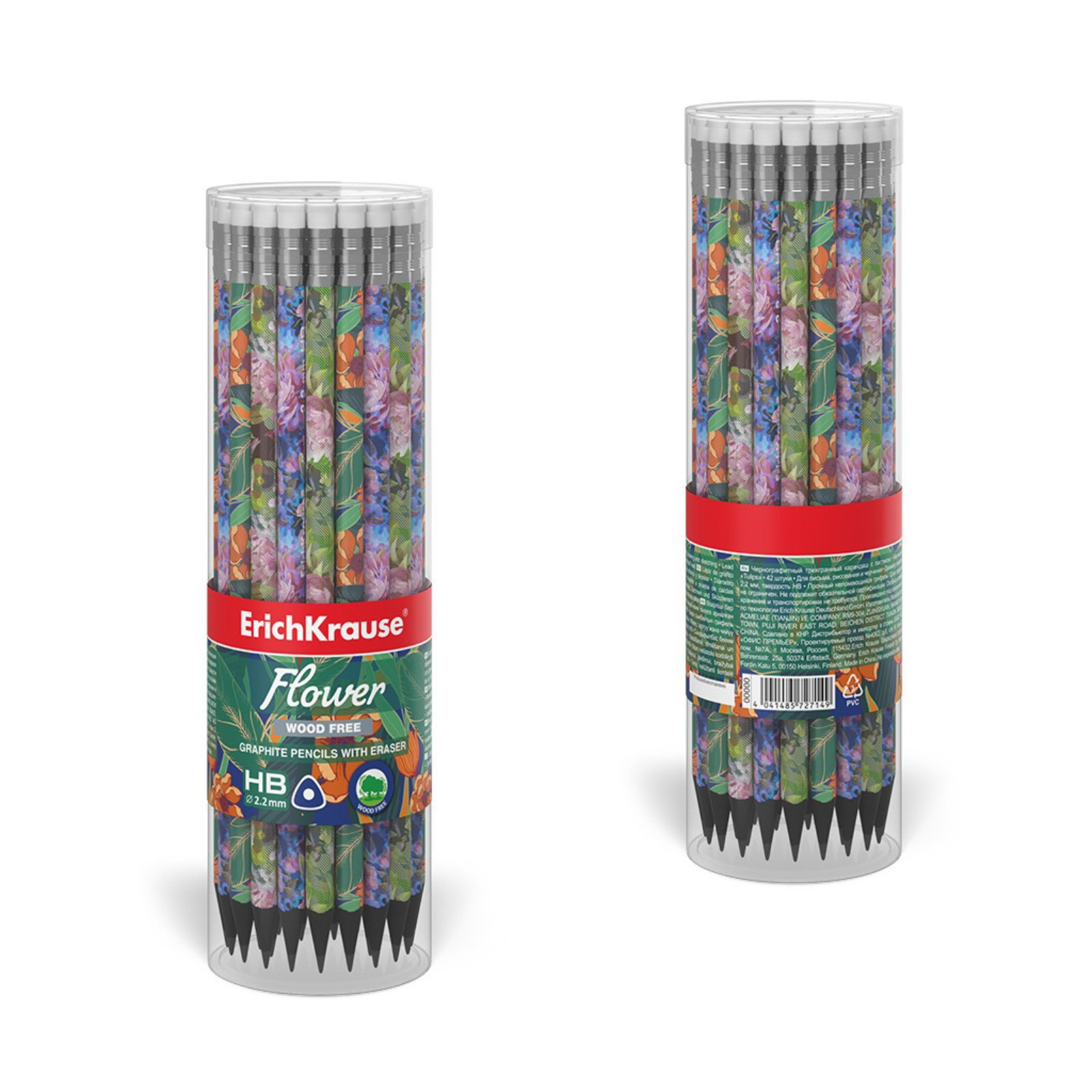 Карандаш чернографитный с ластиком "Flower", HB, грифель d=2.2 мм, пластик, трёхгранный в тубусе, микс, 0.7x18.8x0.7 см., ErichKrause, Китай