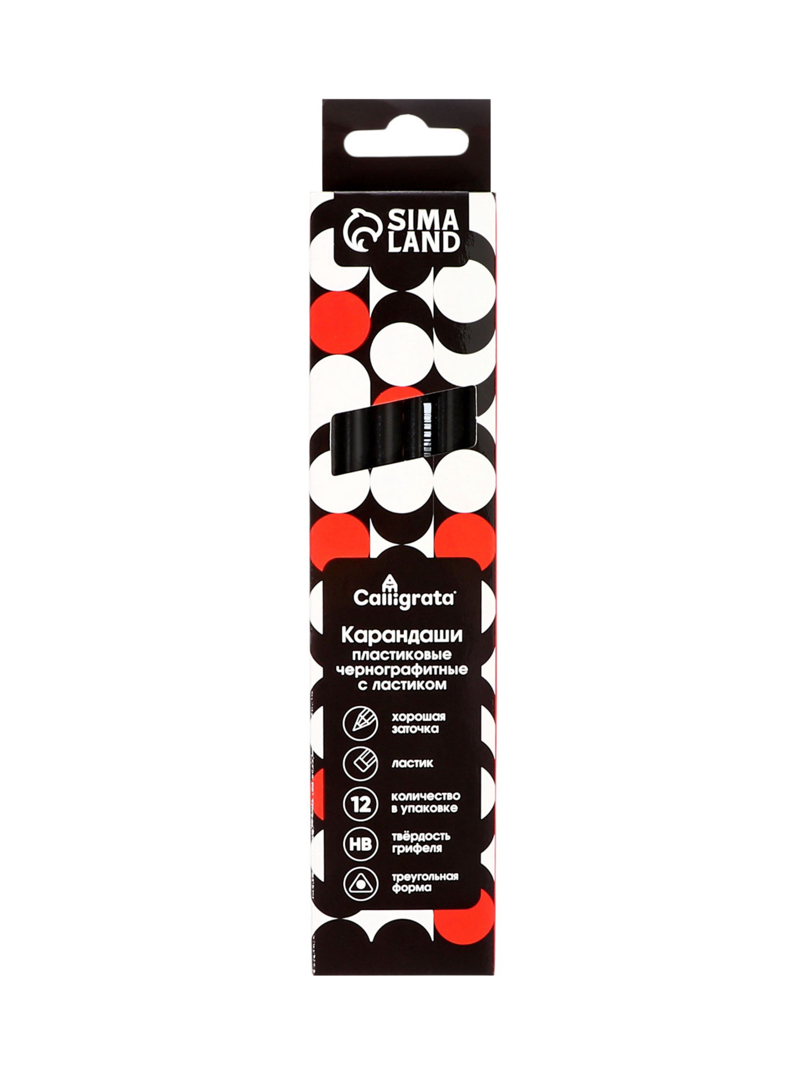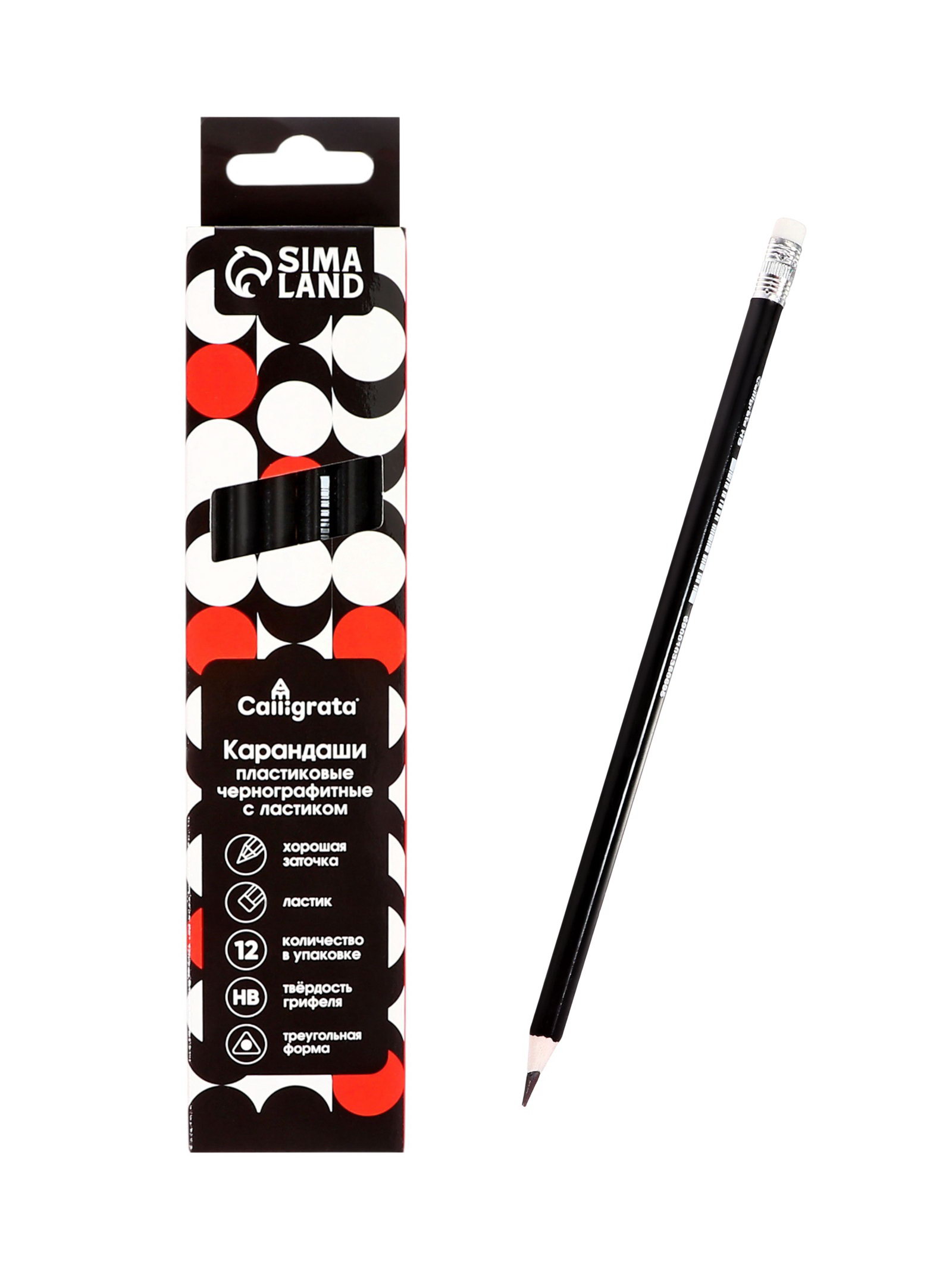 Набор карандашей чернографитных 12 штук, Classic, с ластиком, заточенные, пластик, трехгранные, черные, Calligrata, Россия