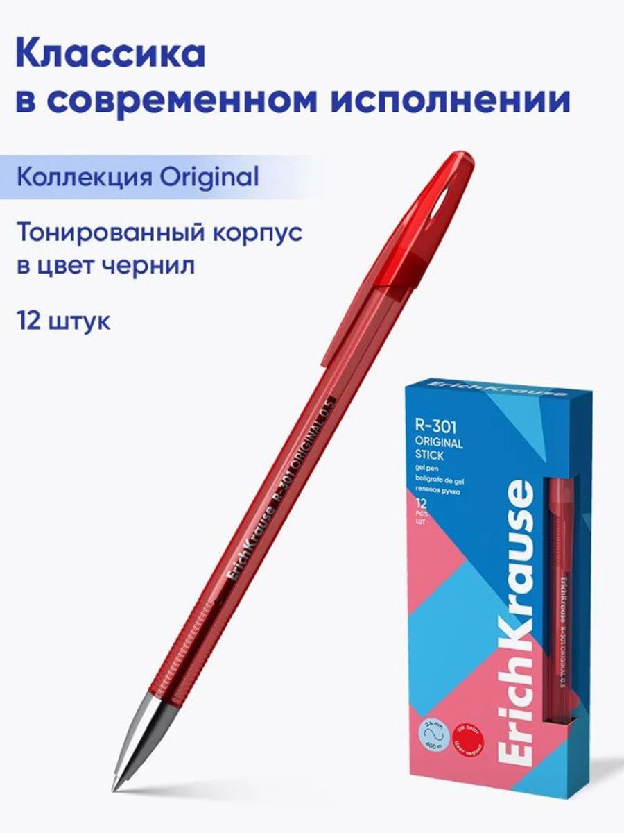 Ручка гелевая R-301 Original Gel, узел 0.5 мм, чернила красные, длина линии письма 600 метров, ErichKrause, Китай