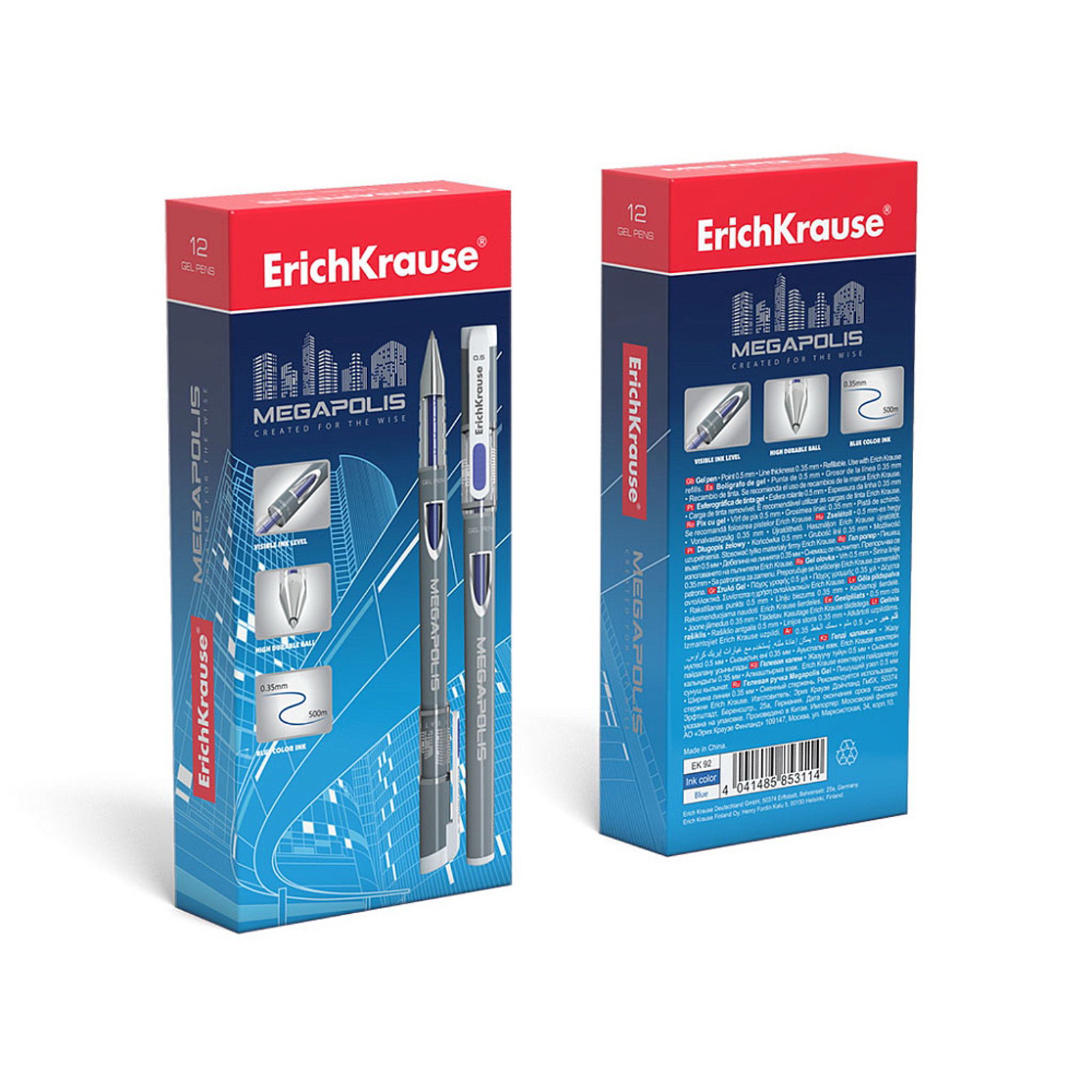 Ручка гелевая MEGAPOLIS GEL, узел 0.5 мм, чернила синие, длина линии письма 500 метров, 1x15x1 см., ErichKrause, Китай