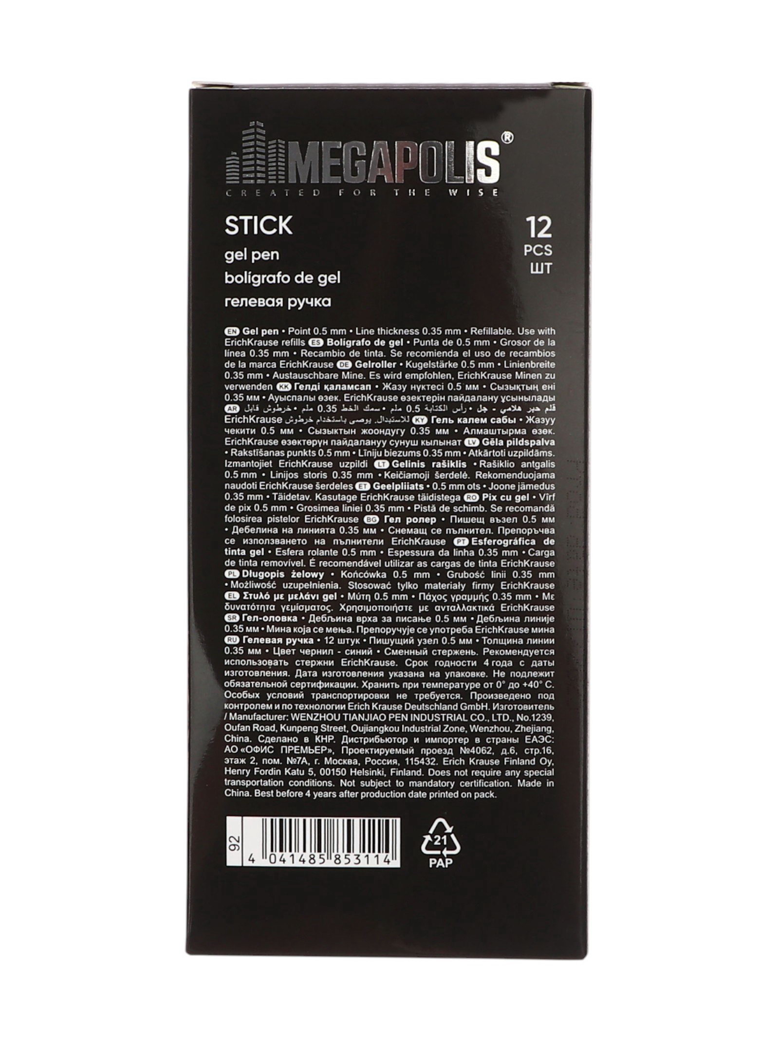 В наборе, шт.: 1, 12 Размер упаковки: 0.9 x 1.3 x 15 см. Диаметр пишущего узла, мм: 0.5 Набор: Нет Цвет стержня: Синий Тип: Неавтоматическая ручка Реестр Минпромторга: Нет Наличие грипа: Нет Наличие грипа: Нет tnved: 9608101000 Стержень заменяемый: Да Штрихкод на единице товара: Да Европодвес: Да Особенности цвета: Без особенностей Количество цветов: 1 Современная гелевая ручка Stick с стандартным типом пишущего узла и заменяемым стержнем. Ручка имеет непрозрачный круглый корпус с окошком контроля уровня чернил и удобной профилированной грип-зоной. 5-канальный пишущий узел с диаметром шарика 0.5 мм в сочетании с гелевыми чернилами обеспечивает точное и быстрое письмо без усилий. Длина непрерывной линии составляет 500 м при толщине 0.4 мм, что является высоким показателем в своей категории. Модель MEGAPOLIS® Gel стала одним из бестселлеров в ассортименте гелевых ручек ErichKrause® более чем в пятидесяти странах мира. | ||
