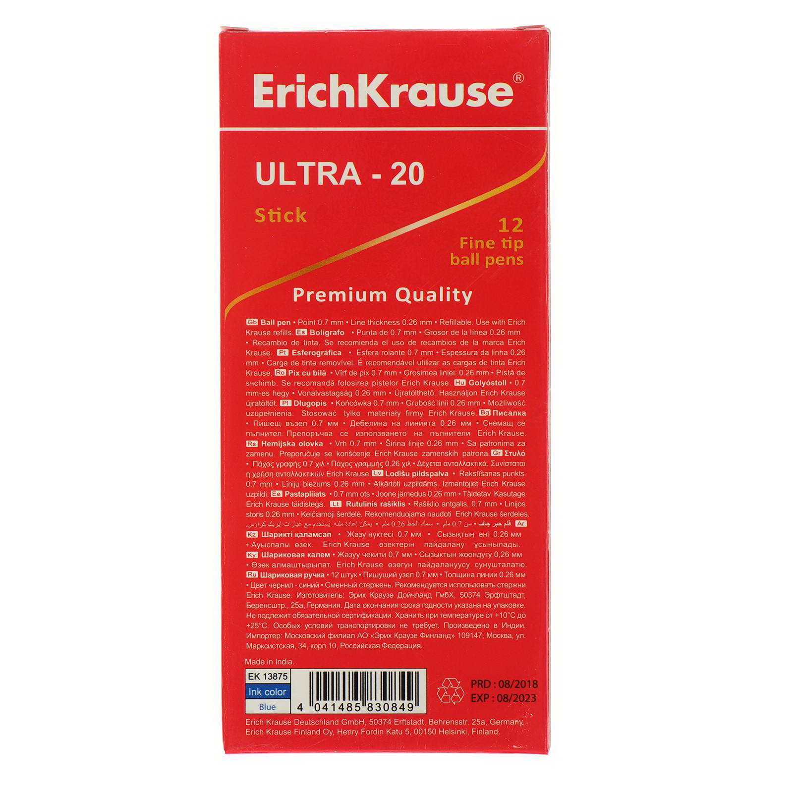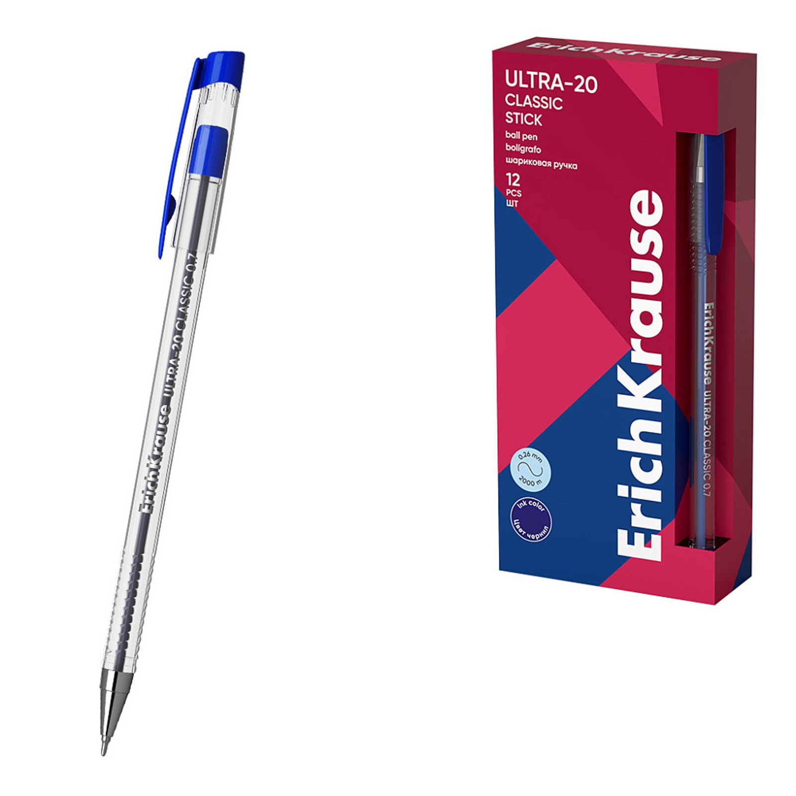 Ручка шариковая ULTRA-20, игольчатый узел 0.7 мм, чернила синие, супермягкое письмо, длина линии письма 2000 метров, 0.9x15x1.5 см., ErichKrause, Индия