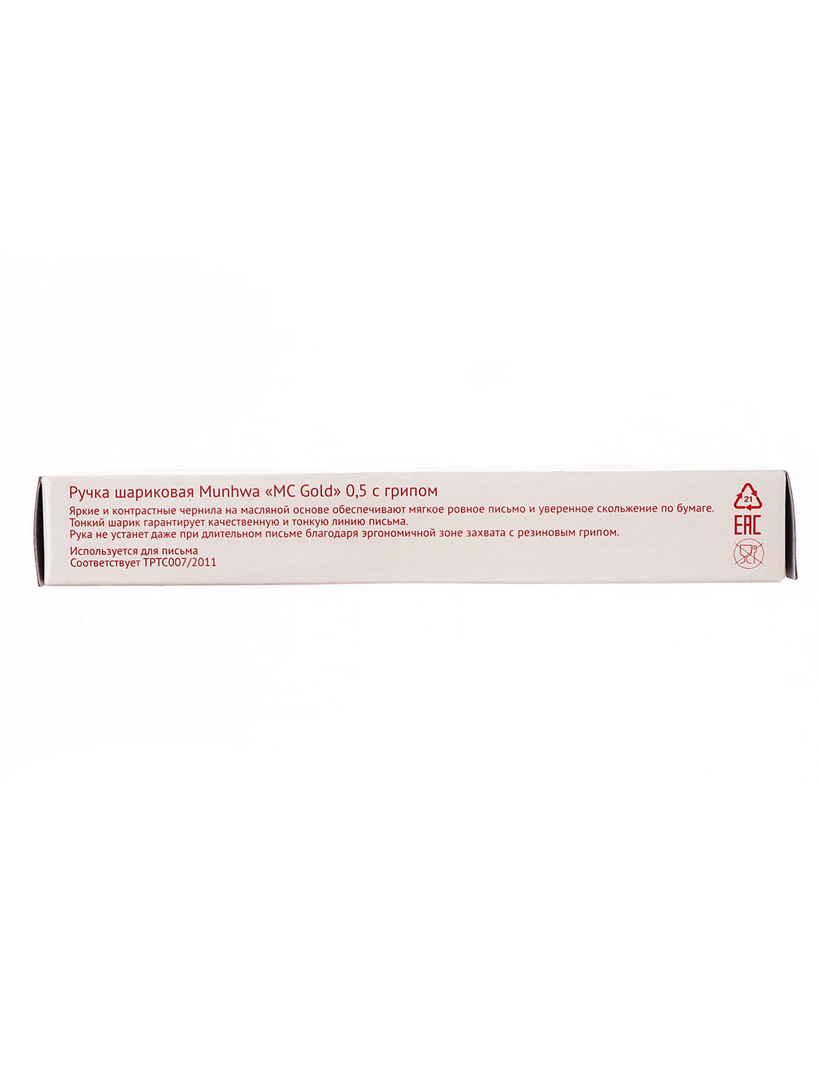 Размер упаковки: 1.2 x 0.8 x 15 см. Тип: Неавтоматическая ручка Вид ручки: Шариковая Особенности ручек: Резиновый упор Цвет стержня: Красный Набор: Нет Диаметр пишущего узла, мм: 0.5 Реестр Минпромторга: Нет Количество цветов: 1 В наборе, шт.: 1 Наличие грипа: Да tnved: 9608101000 Стержень заменяемый: Да Штрихкод на единице товара: Да Европодвес: Нет Температурное ограничение транспортировки: Да Легендарная шариковая ручка MunHwa MC Gold - одна из самых узнаваемых шариковых ручек. Особенности Характеристики