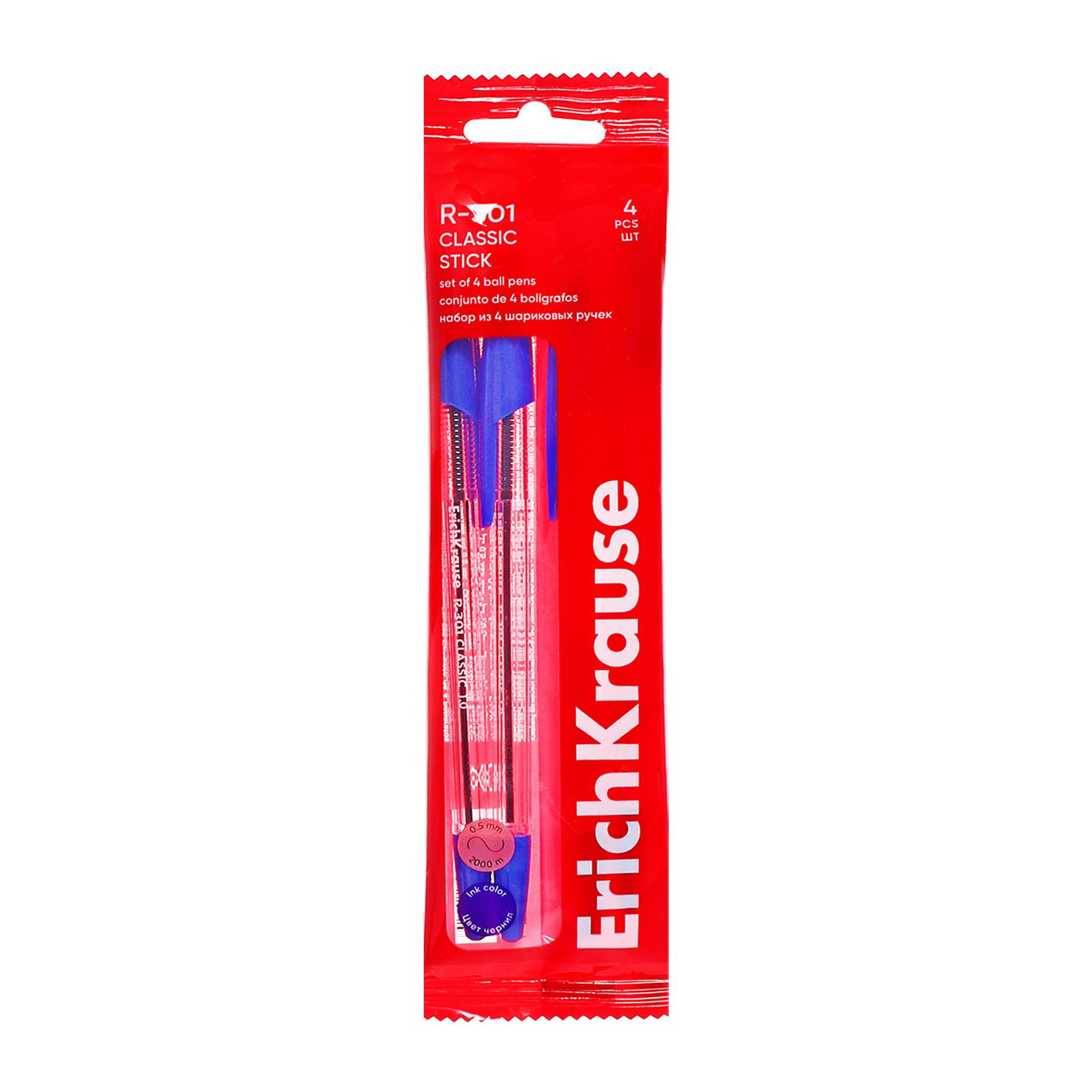 Набор ручек шариковых 4 штуки R-301, узел 1.0 мм, чернила синие, длина линии письма 2000 метров, европодвес, ErichKrause, Китай