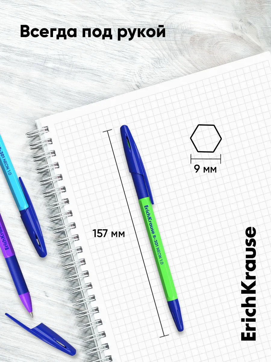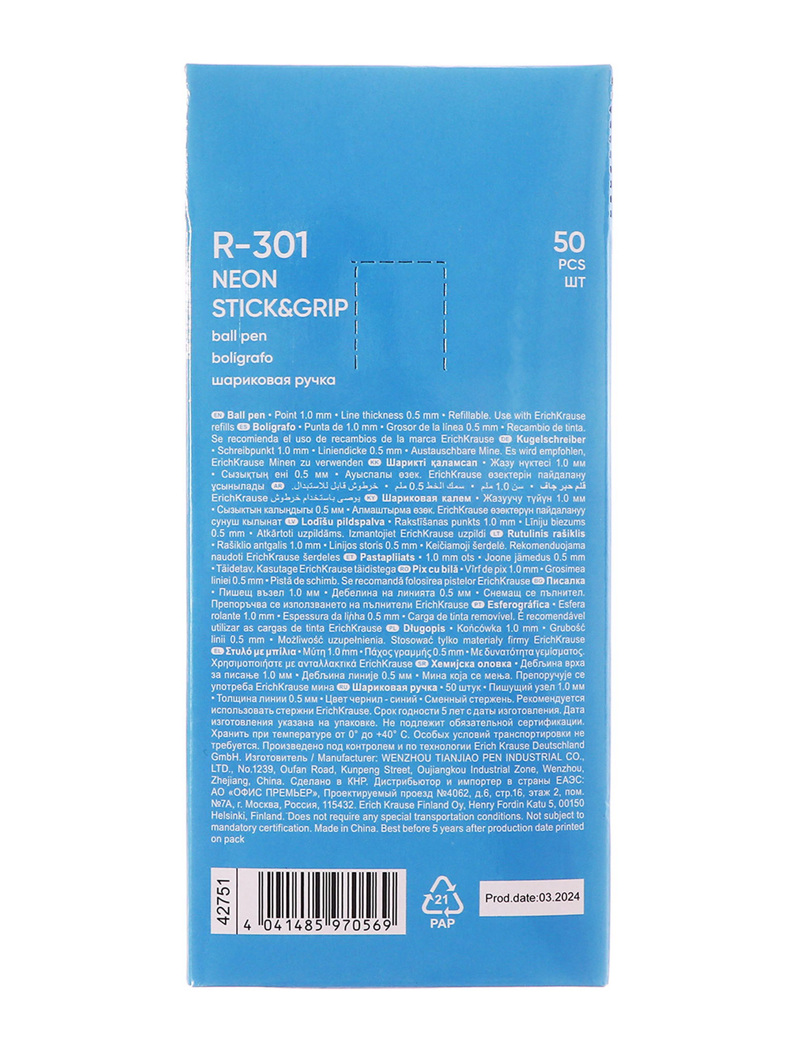 Ручка шариковая R-301 Neon Stick & Grip, узел 0.7-1.0 мм, чернила синие, резиновый держатель, длина линии письма 2000 метров, МИКС, ErichKrause, Китай