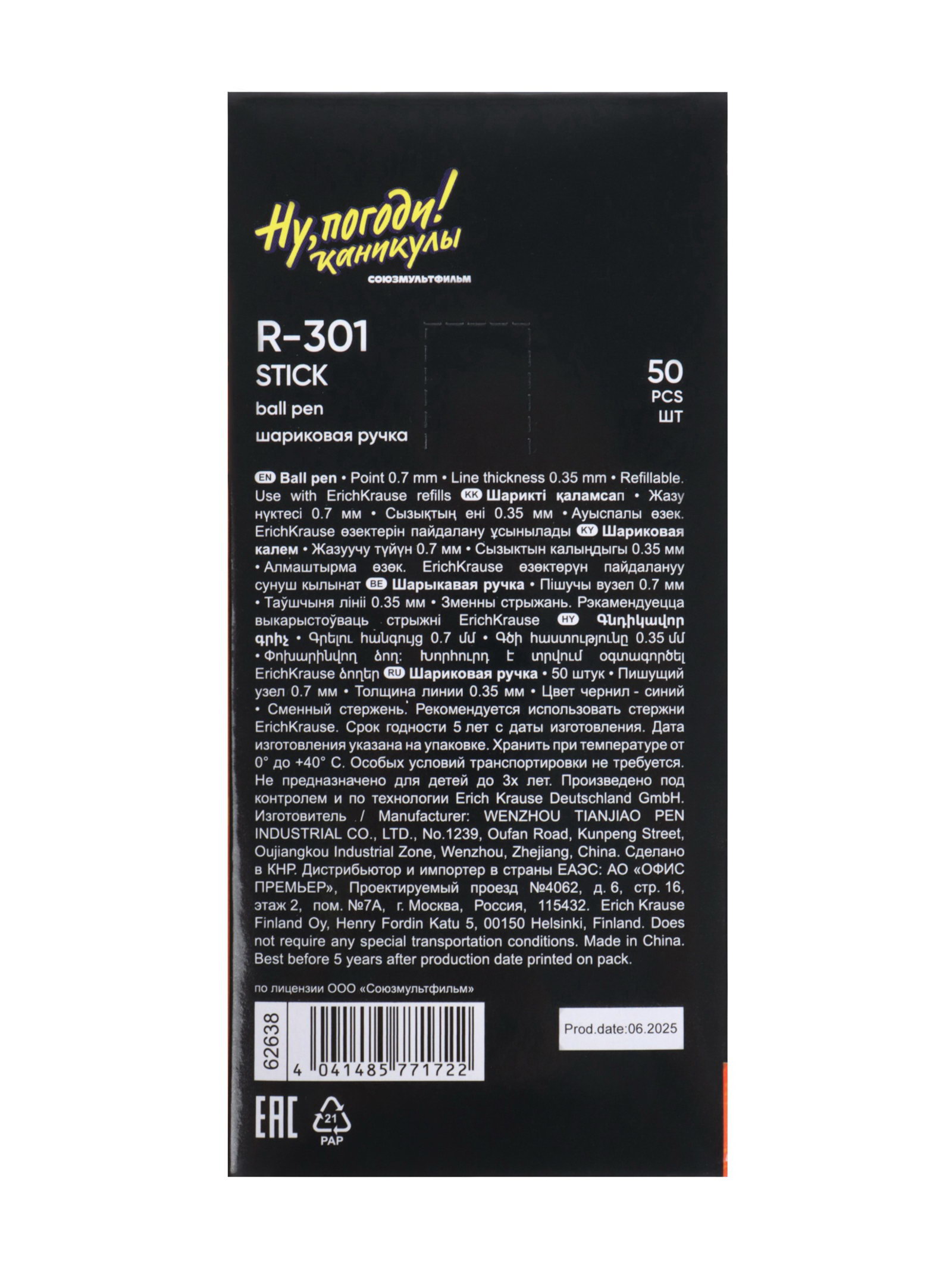 Ручка шариковая R=301 Classic Stick "Ну, Погоди!", узел 0.7 мм, чернила синие, длина линии письма 2000 метров, микс, 0.9x15.5x1.2 см., ErichKrause, Китай