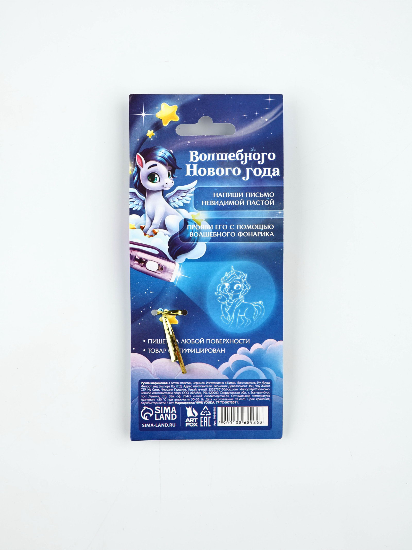 Размер упаковки: 8 x 18 x 1.5 см. tnved: 9608101000 Набор: Нет Символ года: Символ года 2026 (Лошадь) Тематика праздника: Новый год Диаметр пишущего узла, мм: 1 Наличие грипа: Нет Вид упаковки: Пакет Европодвес: Да Штрихкод на единице товара: Да Адресат: Без адресата Материал упаковки: Полиэтилен Цвет стержня: Невидимый Погрузись в волшебный мир фантазий и чудес! • Напиши письмо невидимой пастой; • Прояви его с помощью волшебного фонарика.