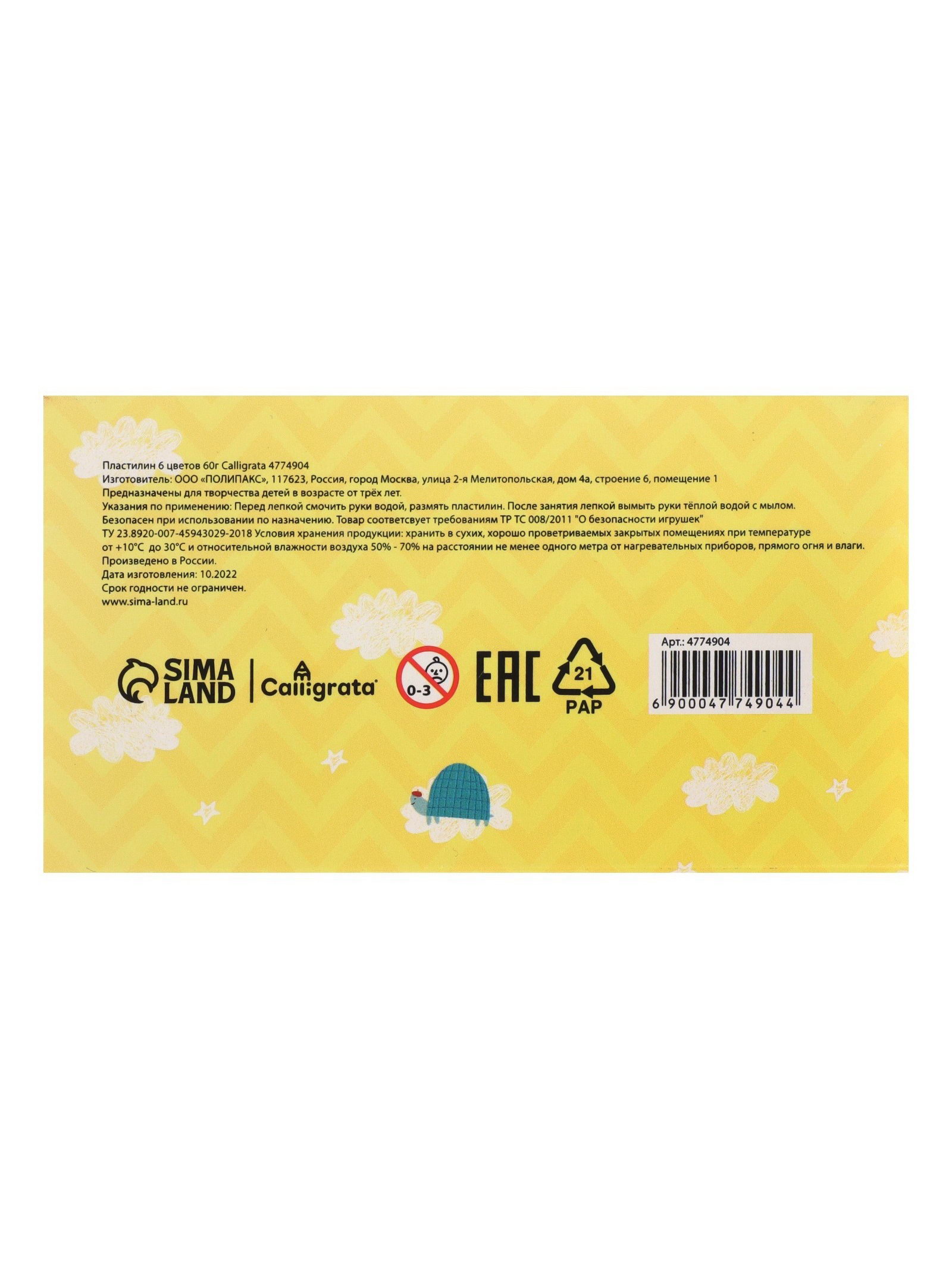 Размер упаковки: 6 x 2 x 10.5 см. Реестр Минпромторга: Нет tnved: 3407000000 tnved: 3407000000 Со стеком (да/нет): Нет Температурное ограничение: Нет Европодвес: Нет Особенности изделия: Без особенностей Вес, г: 60 Количество цветов: 6 Штрихкод на единице товара: Да Температурное ограничение транспортировки: Нет Возраст: От 3 лет Тематика набора: Лепка Пластилин предназначен для лепки и моделирования в детском творчестве. Яркий и пластичный пластилин изготовлен из высококачественных компонентов. Огромный набор пластилина красивых цветов разных оттенков: от нежных до более насыщенных. В меру мягкий и в меру твёрдый. Является отличным материалом для обучения лепке. Пластилин рекомендуют не только педагоги и родители, но и профессиональные мультипликаторы. Не имеет выраженного неприятного запаха. Имеет яркие, не приглушённые чистые цвета, которые отлично смешивающиеся друг с другом. Отлично держит форму, не рвётся и не крошится при перегибании. Не липнет к рукам. Идеально вытягивается до тончайшей колбаски. Можно делать очень маленькие детали, которые не деформируются при соединении. | ||