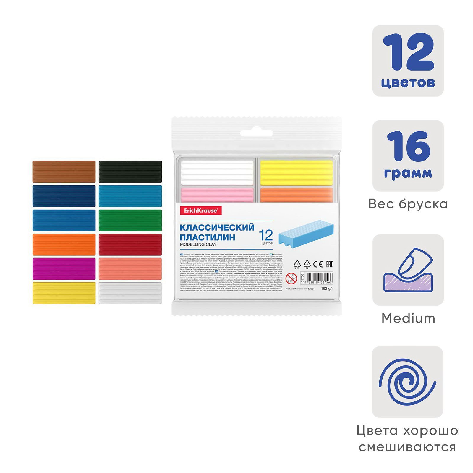 Размер упаковки: 16 x 1.5 x 15 см. Реестр Минпромторга: Да tnved: 3407000000 Со стеком (да/нет): Нет Температурное ограничение: Нет Европодвес: Да Количество цветов: 12 Вес, г: 192 Штрихкод на единице товара: Да Особенности изделия: Без особенностей Температурное ограничение транспортировки: Нет Возраст: От 3 лет Тематика набора: Лепка Классический пластилин ErichKrause® является оптимальным выбором для школьного портфеля. Хорошая пластичность и средний уровень мягкости пластилина позволяют применять его для развития сенсорных навыков и тренировки мелкой моторики ребенка. Пластилин изготовлен из безопасных компонентов высокого уровня качества, не пачкает руки, не имеет запаха.