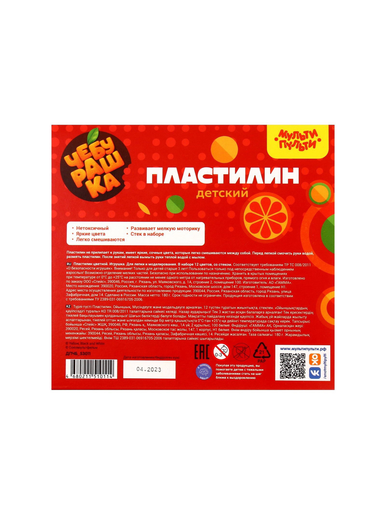 Пластилин "Мульти-Пульти. Чебурашка", 12 цветов, 180 г, со стеком, картонная упаковка, ЧЕБУРАШКА, Россия