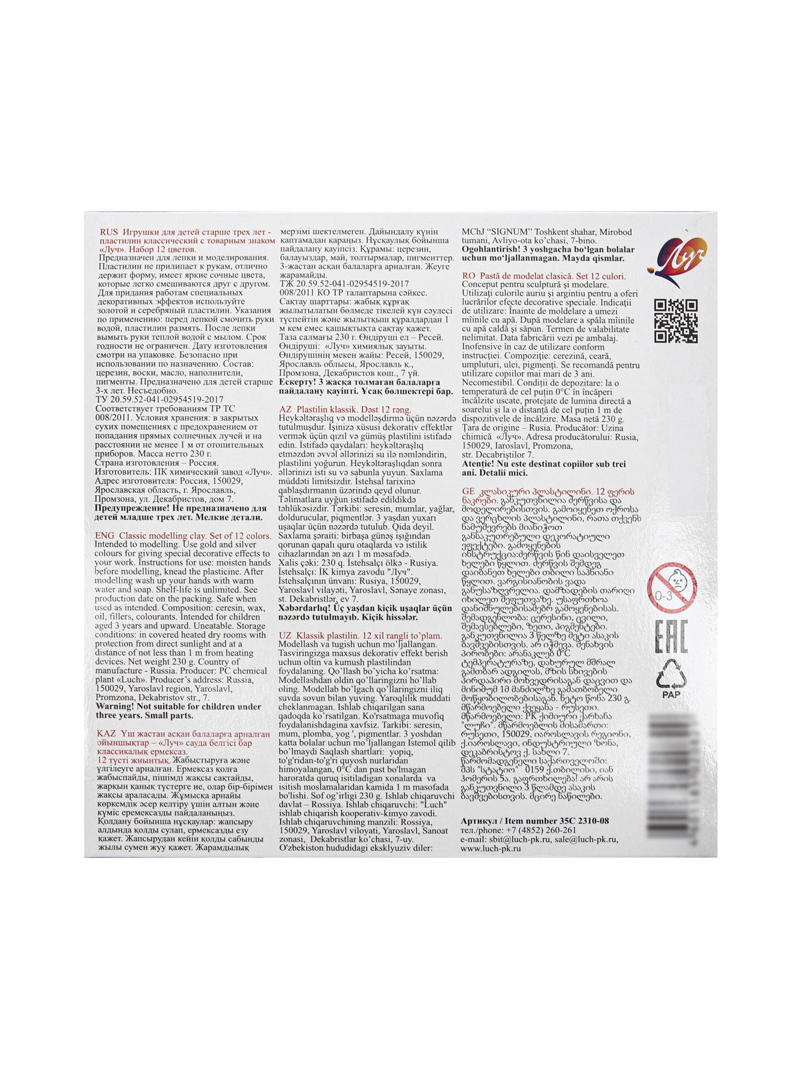 Размер упаковки: 17 x 1.8 x 16.5 см. tnved: 3407000000 Температурное ограничение: Нет Со стеком (да/нет): Да Европодвес: Нет Температурное ограничение транспортировки: Нет Количество цветов: 12 Штрихкод на единице товара: Да Этот набор мягкого воскового пластилина отличный выбор для детского творчества и развивающих занятий. 12 ярких цветов общим весом 230 г обеспечивают богатую палитру для лепки. Мягкая восковая формула легко разминается даже маленькими ручками, не требуя длительного разогрева, и идеально подходит для создания как простых фигурок, так и сложных композиций. В комплекте стек для вырезания и проработки деталей. Пластилин не липнет к рукам, хорошо держит форму и безопасен для детей. Мягкий восковой пластилин для творчества