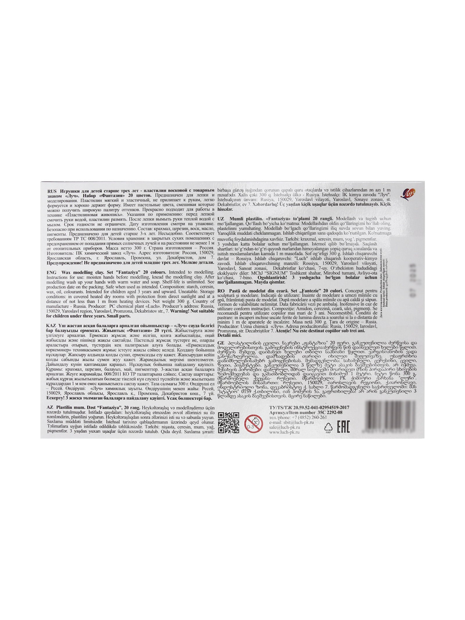 Размер упаковки: 16.6 x 1.8 x 25.2 см. tnved: 3407000000 Температурное ограничение: Нет Штрихкод на единице товара: Да Температурное ограничение транспортировки: Нет Со стеком (да/нет): Да Европодвес: Нет Количество цветов: 20 Пастельный восковой пластилин "Фантазия", 20 цветов, 300 г набор для творческой лепки дома и в учебных занятиях. Пластилин мягкий, легко формуется, а стек помогает прорабатывать детали и создавать аккуратные фигуры и аппликации. Компактная коробка из плотного картона сохраняет порядок и упрощает хранение. Набор подходит детям от 3 лет и способствует развитию воображения, цветового восприятия и мелкой моторики. Особенности