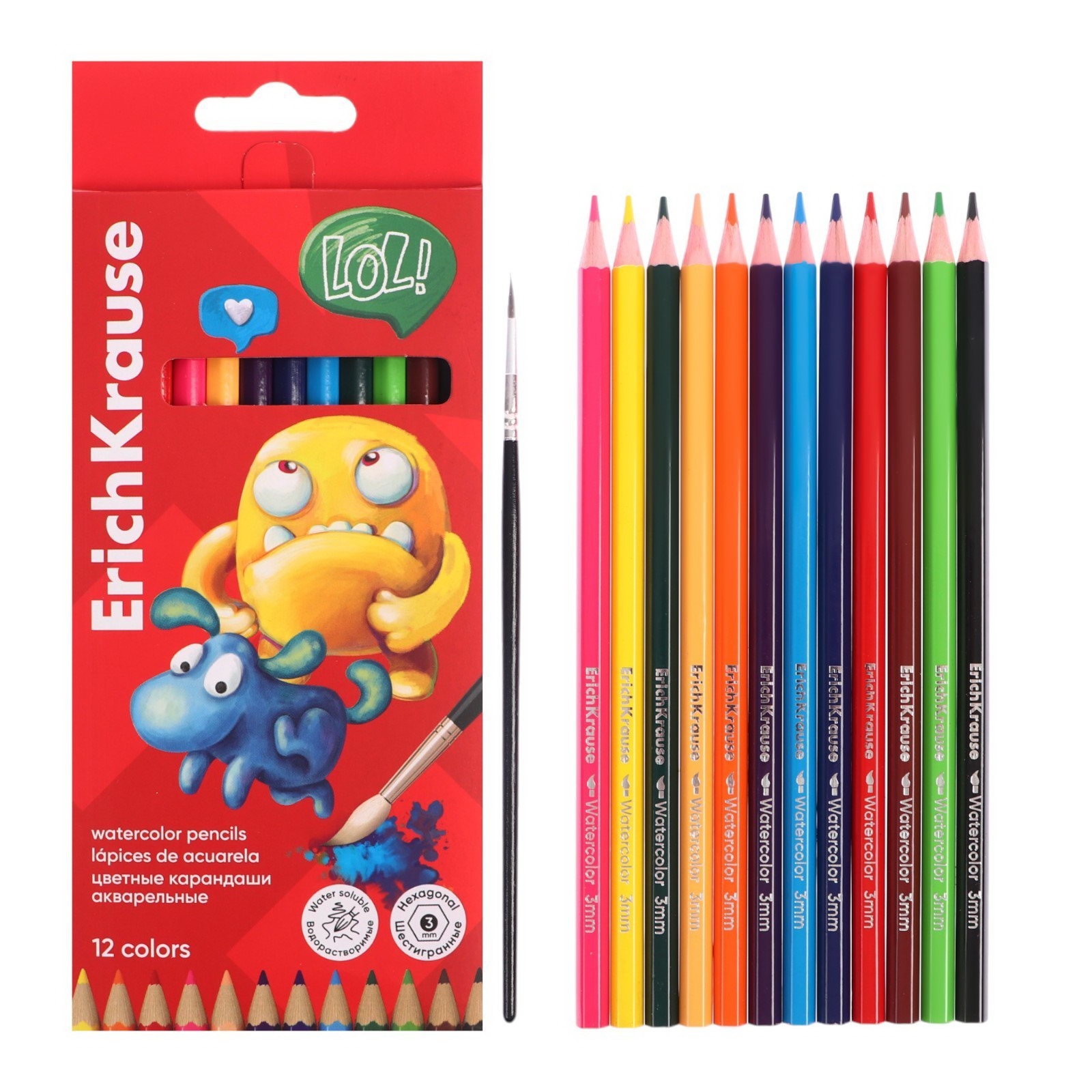 Карандаши акварельные 12 цветов "Jolly Friends", дерево, шестигранные с кисточкой, европодвес, 20.8x0.8x9 см., ErichKrause, Китай