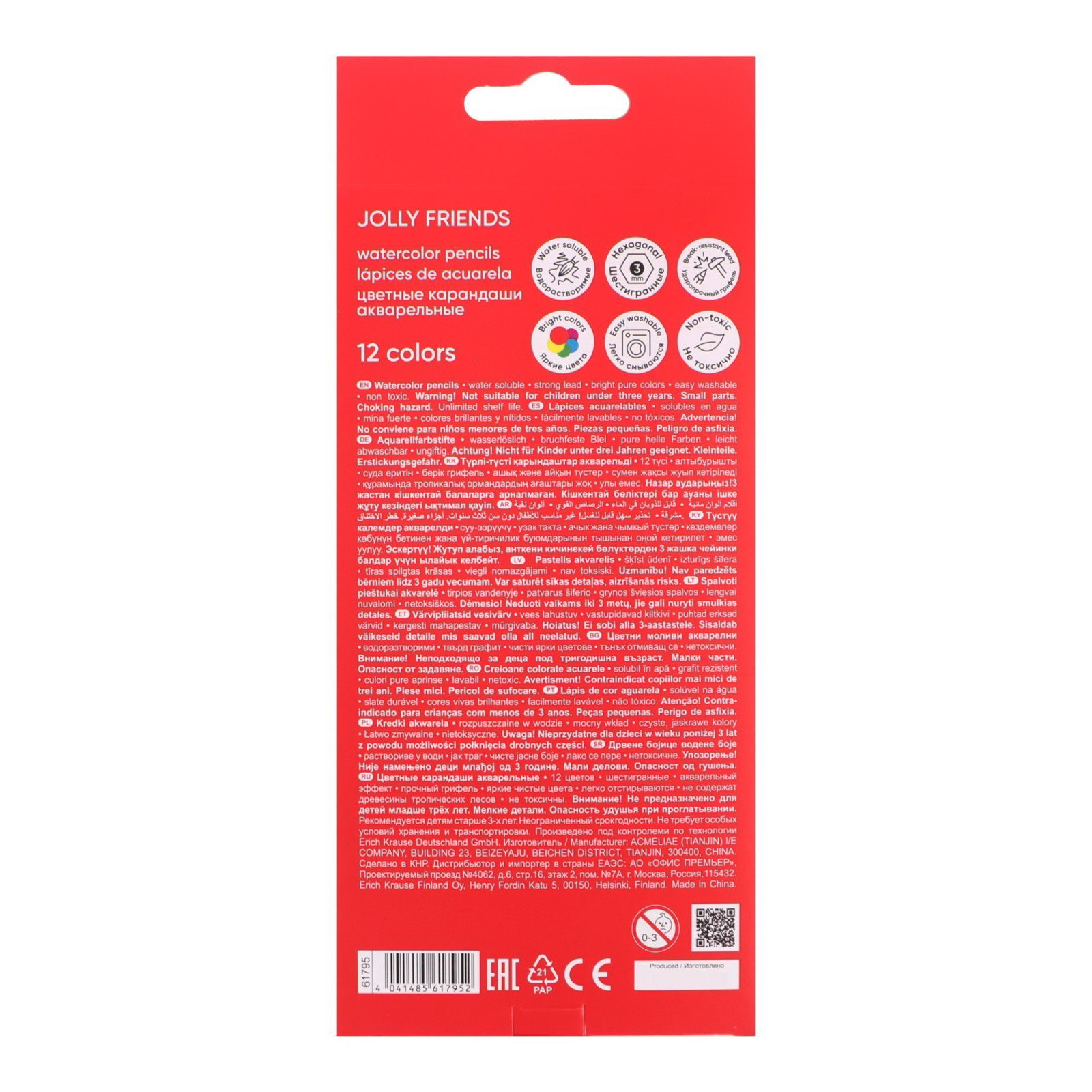 Размер упаковки: 9 x 0.8 x 20.5 см. Температурное ограничение: Нет Европодвес: Да Штрихкод на единице товара: Да Количество цветов: 12 Форма: Шестигранные Форма: Шестигранные tnved: 9609110000 Акварельные шестигранные цветные карандаши из отборной древесины с суперярким грифелем. После нанесения на бумагу след от карандаша может быть использовн для создания акварельного эффекта при помощи воды и кисточки, входящей в комплект. Грифель диаметром 3 мм не царапает бумагу и не крошится при рисовании. Мягкая древесина и идеальная центровка грифеля гарантируют легкую заточку с экономным расходом карандаша. Характеристики