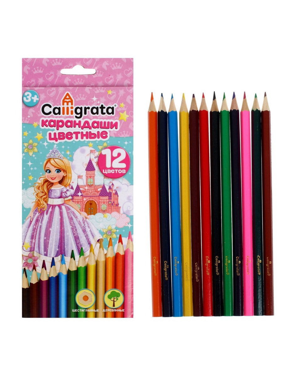 Карандаши "Принцесса", цветные, 12 цветов, деревянные, шестигранные, Calligrata, Китай
