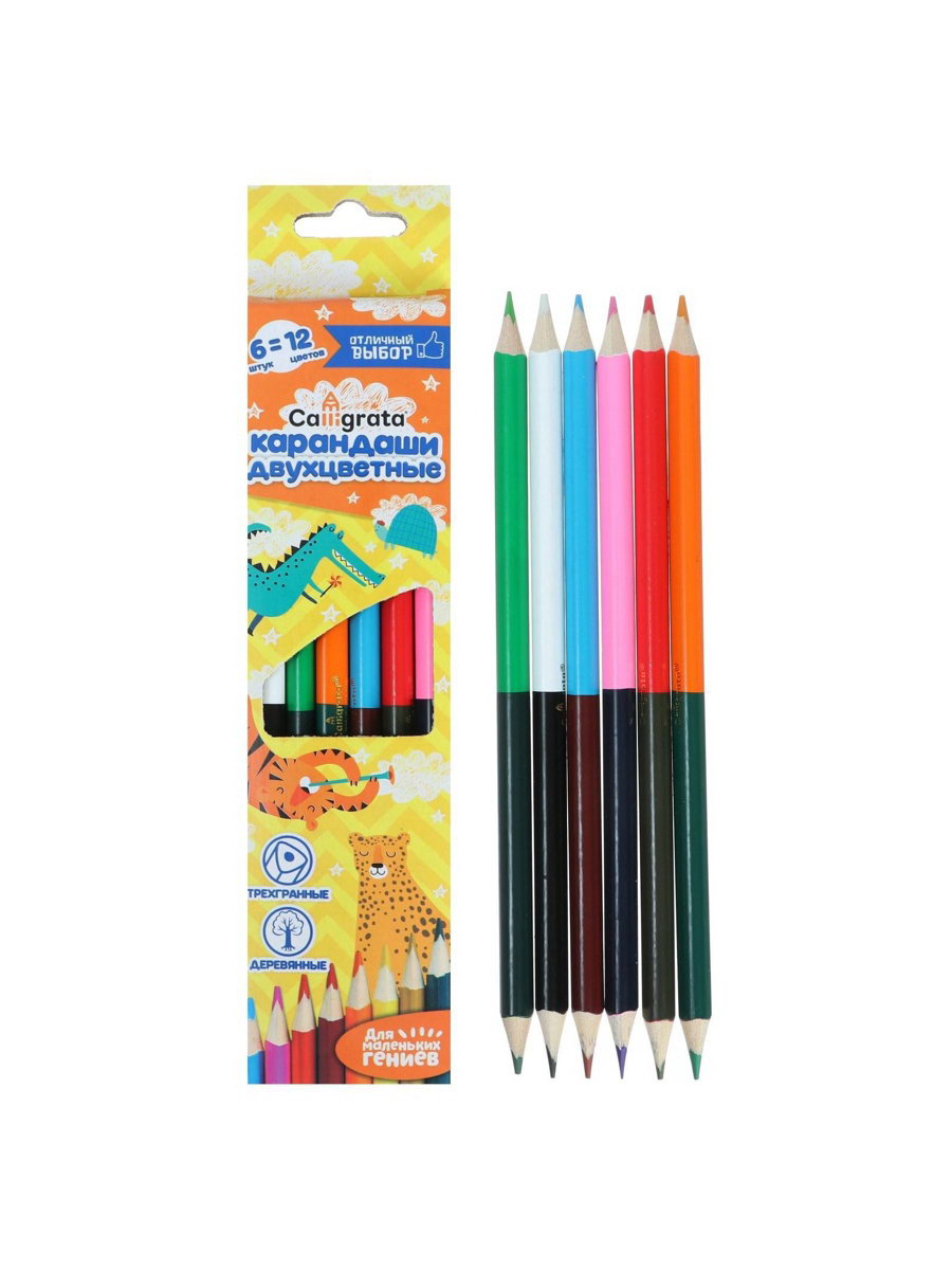 Карандаши цветные, двухцветные, 12 цветов, 6 шт., деревянные, трёхгранные, Calligrata, Китай