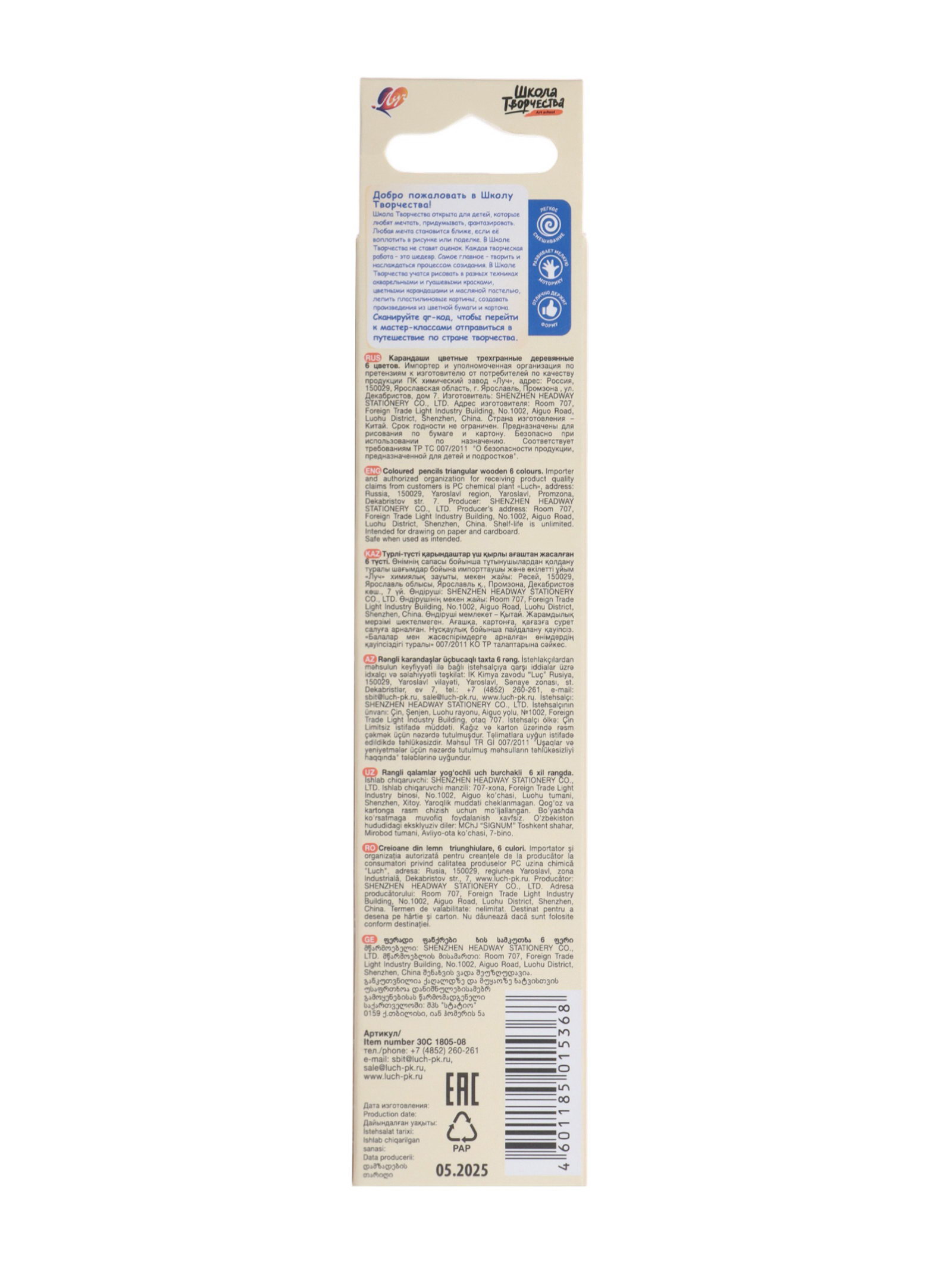 Размер упаковки: 4.5 x 0.8 x 21 см. Штрихкод на единице товара: Нет Материал корпуса: Дерево Реестр Минпромторга: Нет tnved: 9609110000 tnved: 9609110000 Особенности: Треугольный Температурное ограничение: Нет Утолщённые: Нет Европодвес: Да Вид упаковки: Коробка картонная Количество цветов: 6 Форма: Трёхгранные Набор: Да Цвет: Разноцветный Карандаши трёхгранные "Школа творчества" предназначены для рисования по бумаге и картону, выпускаются в наборах 6, 12, 18, 24 цвета. Корпус карандаша изготовлен из мягкой древесины тополя. Эргономичная трёхгранная форма снижает усталость и обеспечивает максимальный комфорт при использовании.