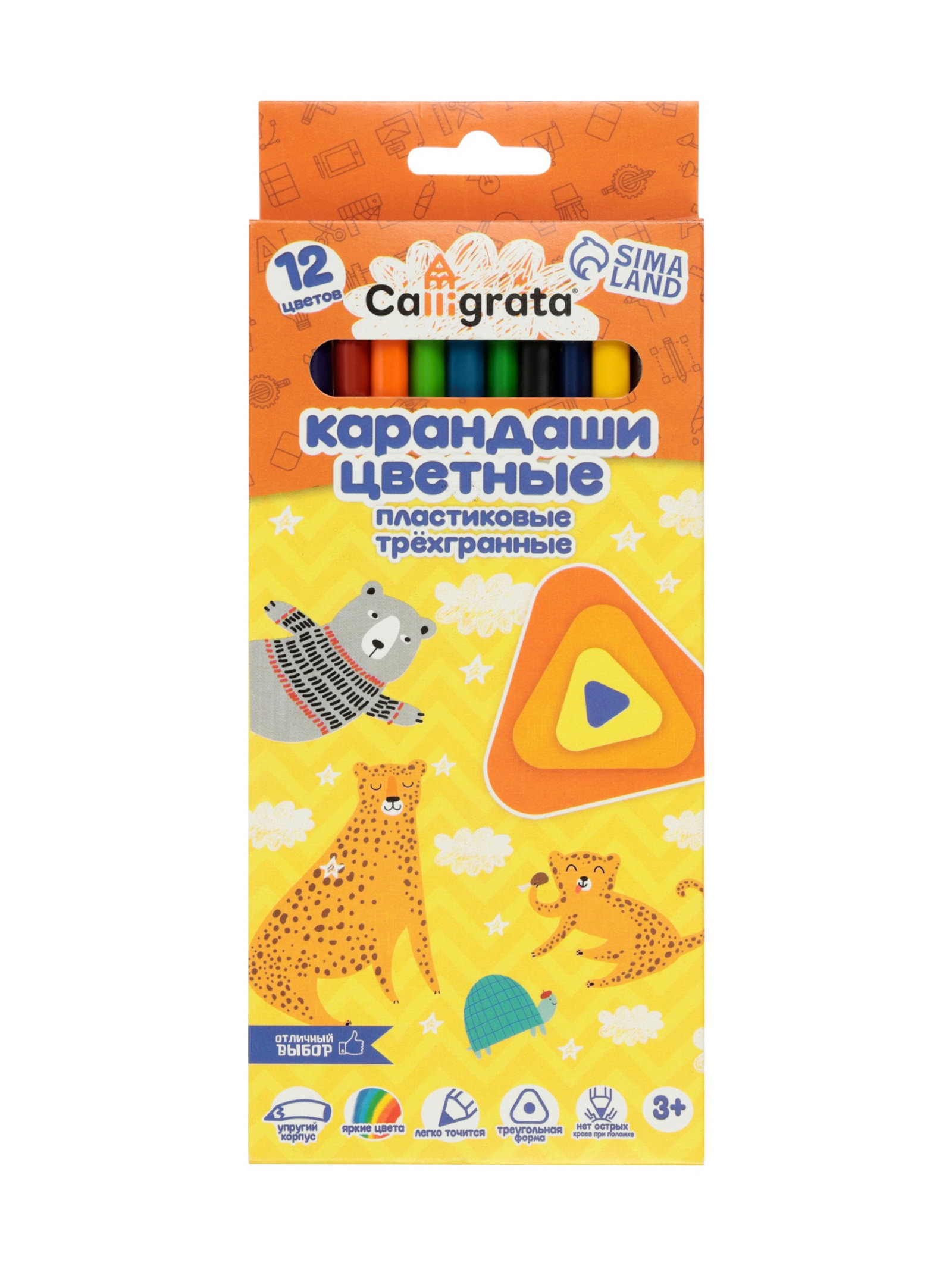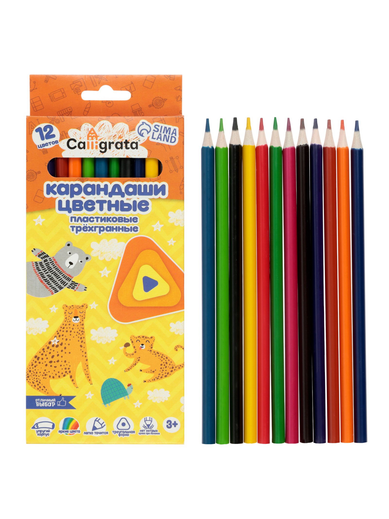 Карандаши 12 цветов, трехгранные, пластиковые, эконом, Calligrata, Россия