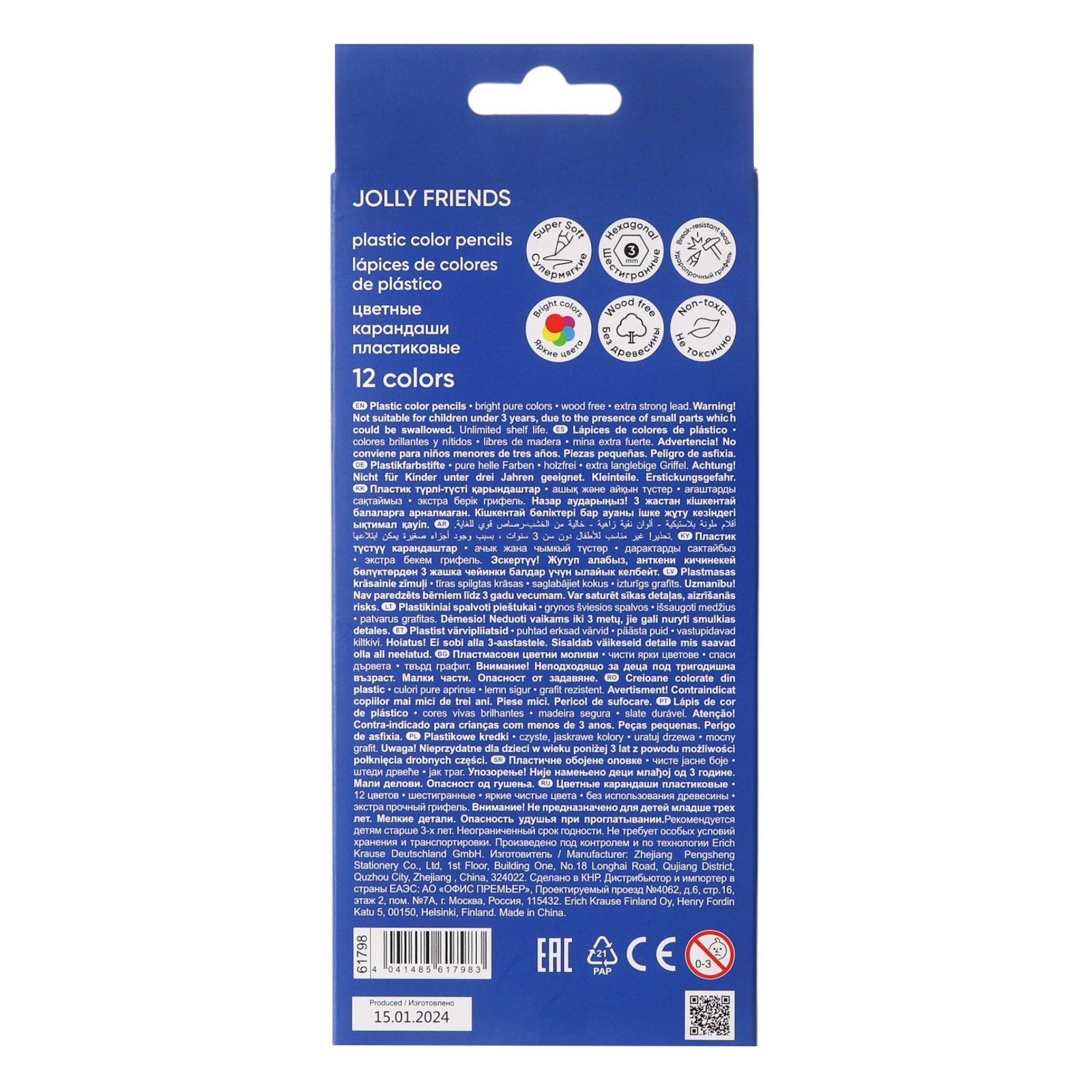 Карандаши 12 цветов Jolly Friends, шестигранные, пластиковые, с европодвесом, 20.3x0.8x8.6 см., ErichKrause, Китай