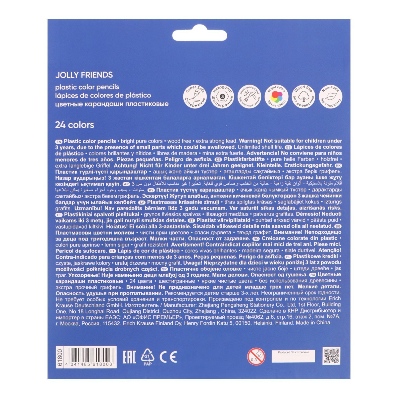 Карандаши 24 цвета "Jolly Friends" пластик, шестигранные, европодвес, 20.3x0.8x17.1 см., ErichKrause, Китай