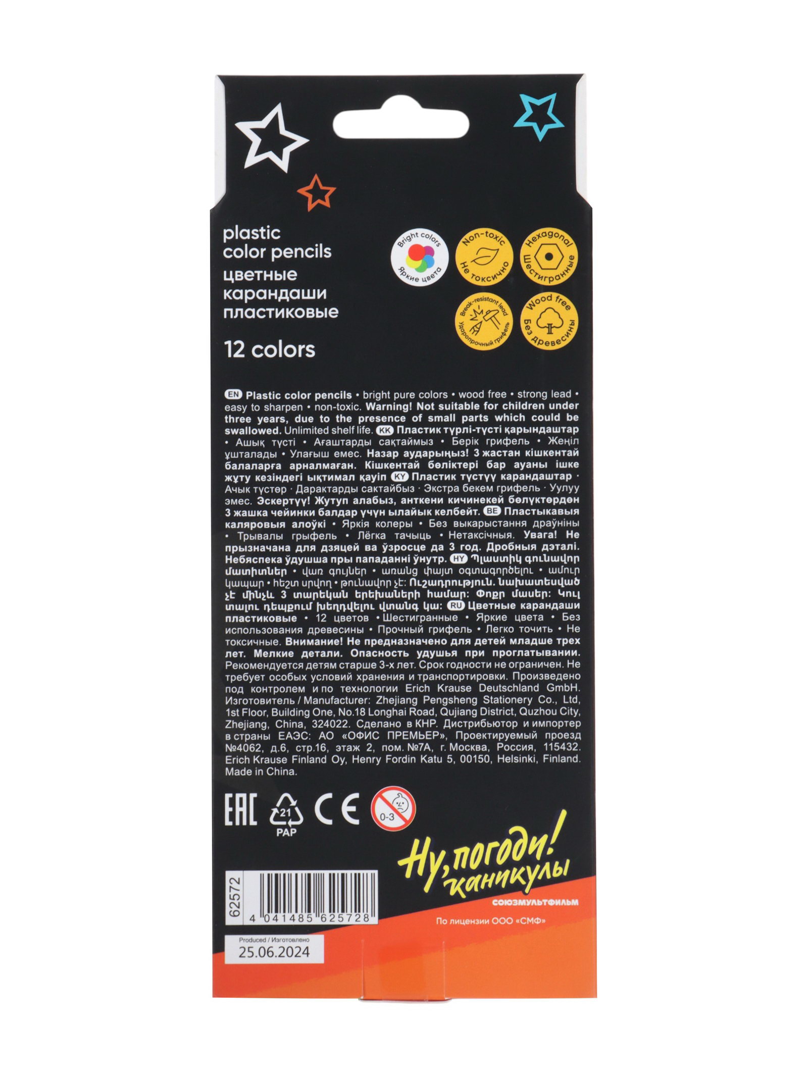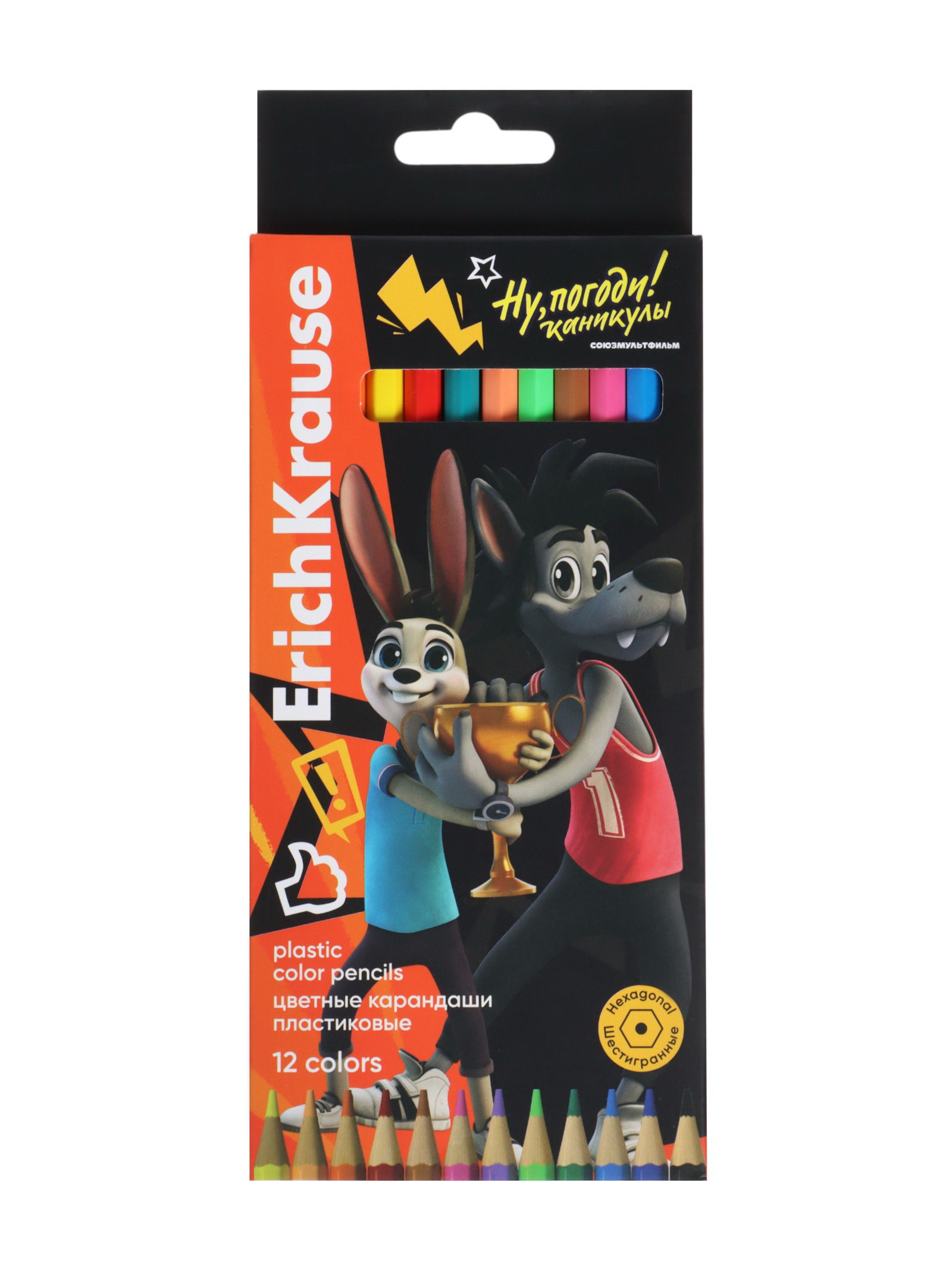 Карандаши 12 цветов "Ну, Погоди!", пластик, шестигранные, 2.6 мм грифель, картонная упаковка, европодвес, 0.8x20.6x8.6 см., ErichKrause, Китай