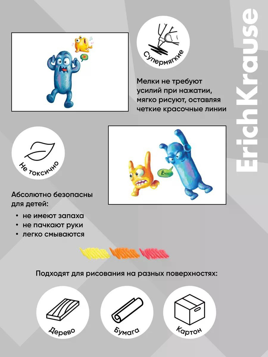 Размер упаковки: 9.7 x 0.9 x 12 см. tnved: 9609909000 Температурное ограничение: Нет Европодвес: Да Утолщённые: Нет Штрихкод на единице товара: Да Форма: Круглые Особенности: Круглый Вид упаковки: Картонная упаковка Вид: Восковая Количество цветов: 8 Классические супермягкие восковые мелки ErichKrause Jolly Friends круглой формы с диаметром корпуса 8 мм Мелки не требуют усилий при нажатии, мягко рисуют, оставляя четкие красочные линии. Подходят для рисования на разных поверхностях, прекрасно ложатся на бумагу, картон и дерево. Мелки предварительно заточены, обернуты в бумагу, устойчивы к поломкам. Характеристики: Количество цветов: 8 Цвет: ассорти Форма корпуса: круглая | ||