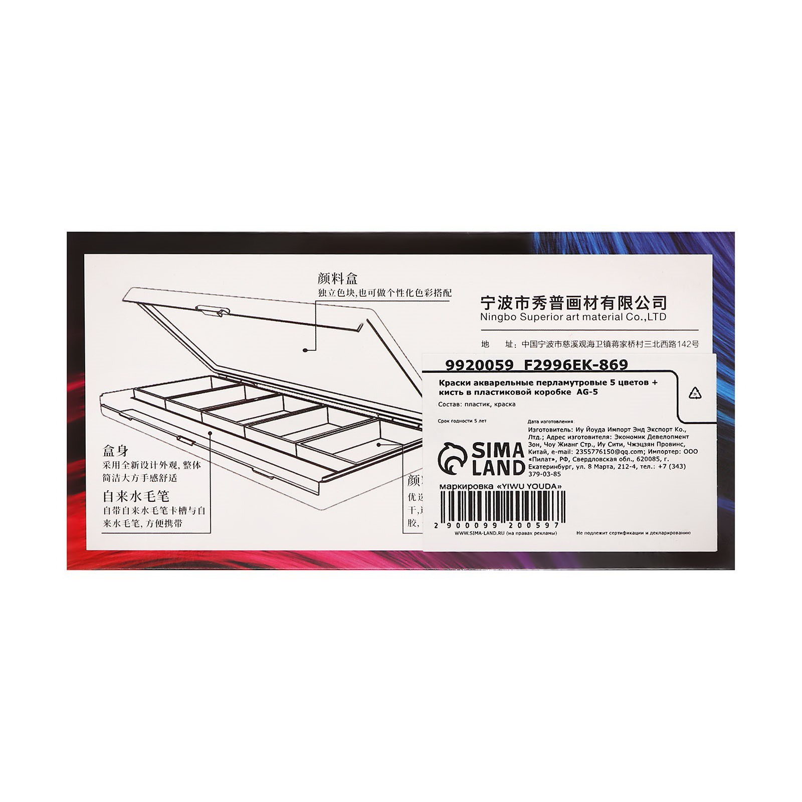 Краски акварельные, перламутровые, + кисть, в пластиковой коробке, 5 цветов, 7.5x14.6x1.7 см., Superior, Китай