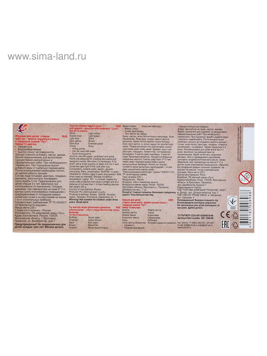 Размер упаковки: 9.5 x 4 x 20 см. Лицензия: Нет Набор: Да Количество цветов: 12 Вид краски: Гуашевая Цвет: МИКС Реестр Минпромторга: Нет Реестр Минпромторга: Нет tnved: 3213100000 Европодвес: Нет Штрихкод на единице товара: Да Температурное ограничение транспортировки: Нет Температурное ограничение: Да Вид упаковки: Коробка картонная Переоценить пользу рисования для детей просто невозможно. А какое же изобразительное искусство без использования самой благородной краски гуашь? Рисовать такими красками очень удобно: гуашь легко размывается водой, хорошо наносится на бумагу, картон, холст, ткань и фанеру, просто смывается с рук и одежды. При высыхании краска приобретает матовую, бархатистую поверхность и совершенно безопасна при использовании. Гуашь 12 цветов x 15 мл ZOO, блок-тара поможет вашему ребёнку создавать красивые яркие картинки, выдумывать невероятные сюжеты и воплощать их в реальность, развивая цветовое восприятие, зрительную память, воображение, мелкую моторику пальцев, ассоциативное, аналитическое и творческое мышление. Рисовать красками очень удобно: гуашь легко размывается водой, хорошо наносится на бумагу, картон, холст, ткань и фанеру, просто смывается с рук и одежды. При высыхании краска приобретает матовую, бархатистую поверхность и совершенно безопасна при использовании. | ||