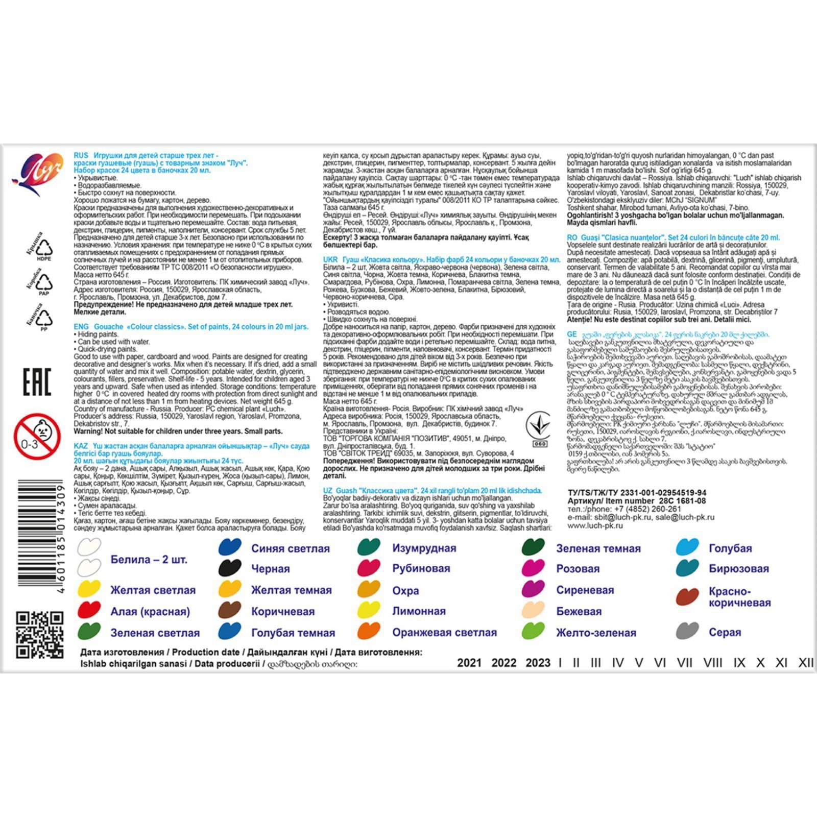 Гуашь 24 цвета x 20 мл "Классика", 4x17.9x27.2 см., Луч, Россия