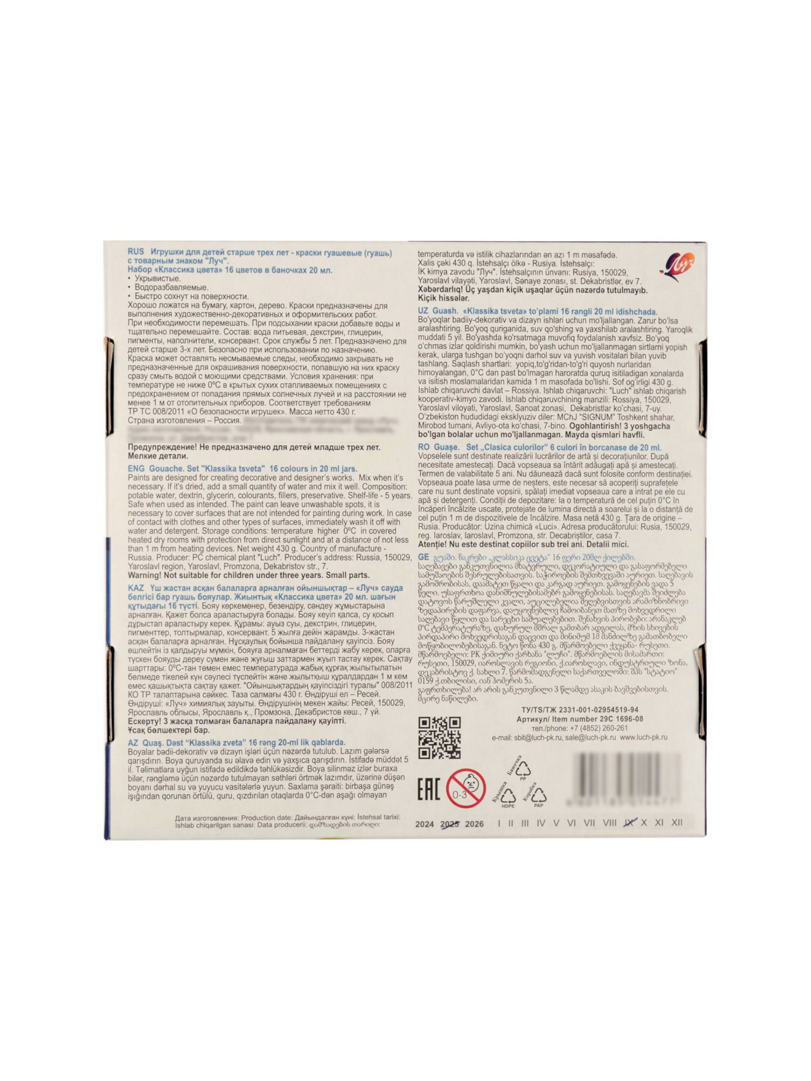 Гуашь 16 цветов x 20 мл "Классика", 20 мл., Луч, Россия