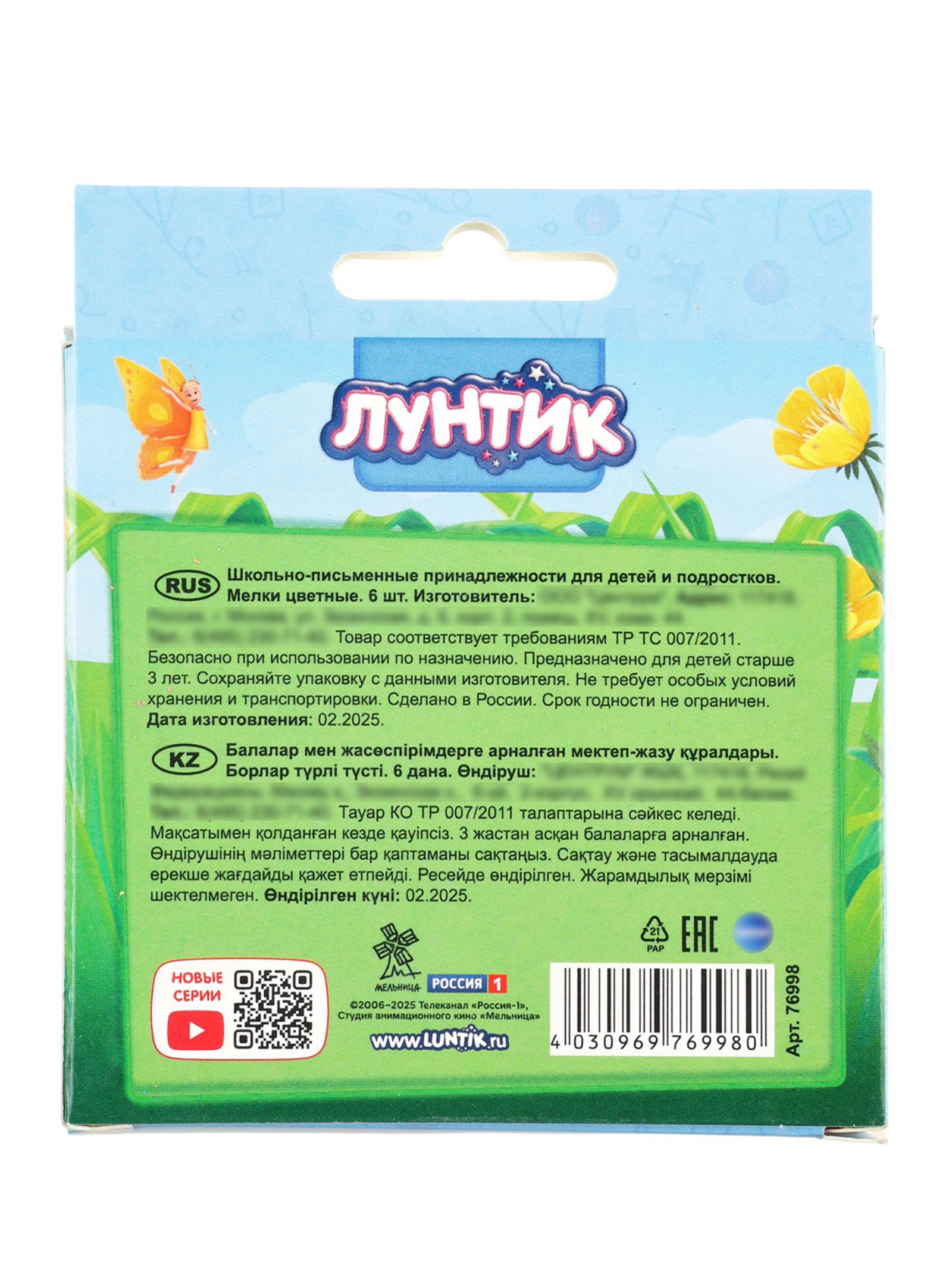 Мелки цветные "Лунтик" 6 шт., 1.2x1.2 см, Centrum, Россия