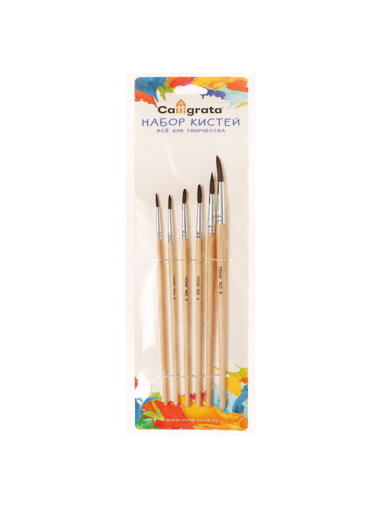 Набор кистей для рисования, пони, 6 штук: № 1, 2, 3, 4, 5, 6, круглые, деревянная ручка, международный размер, Calligrata, Китай