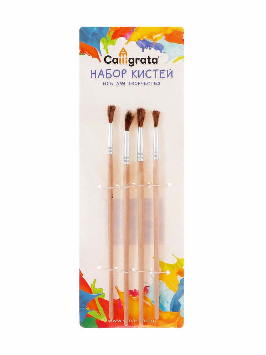 Набор кистей для рисования, пони, 4 штуки: № 2, 4, 6, 8, круглые, деревянная ручка, международный размер, 7x0.8x21 см., Calligrata, Китай