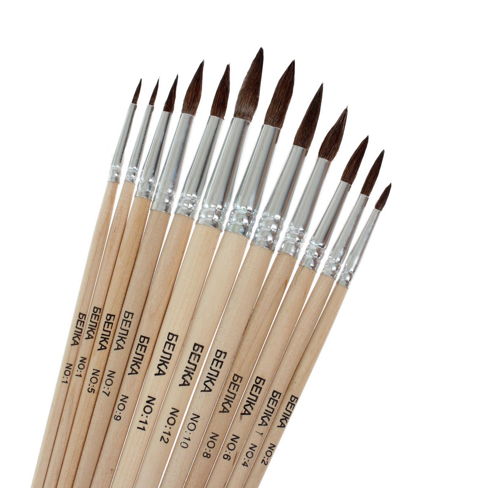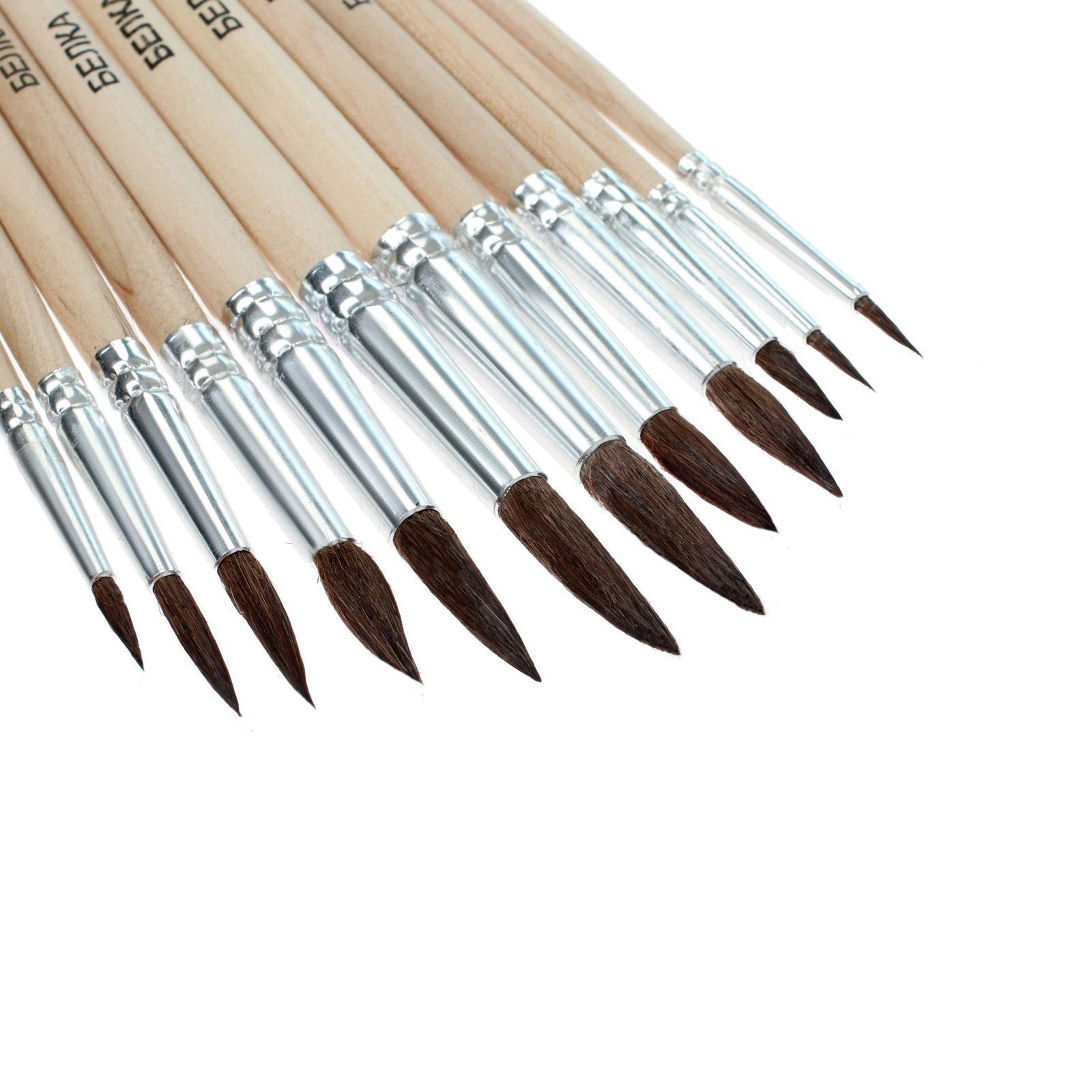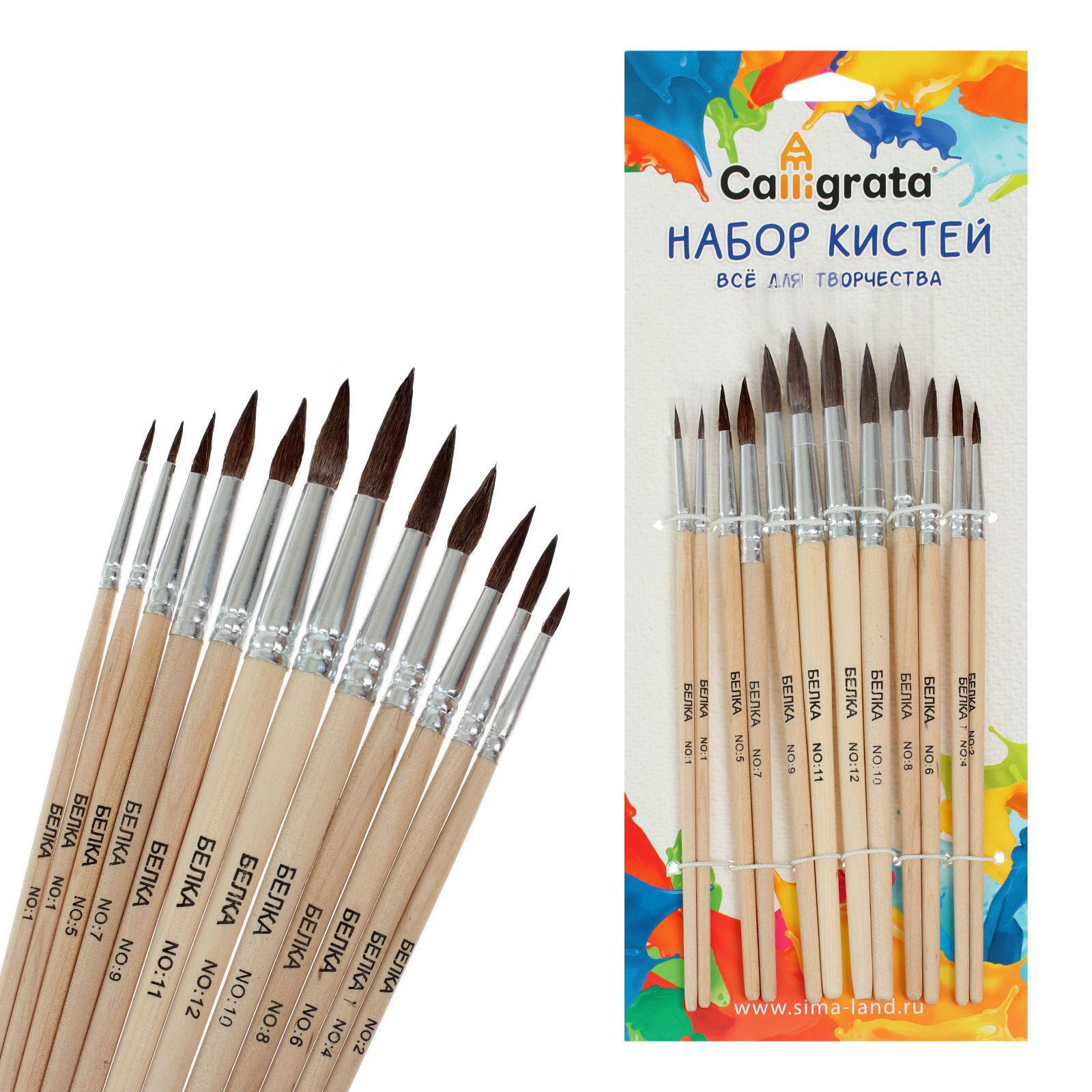 Набор кистей для рисования, белка, 12 штук: № 1, 2, 3, 4, 5, 6, 7, 8, 9, 10, 11, 12, круглые, деревянная ручка, международный размер, Calligrata, Китай