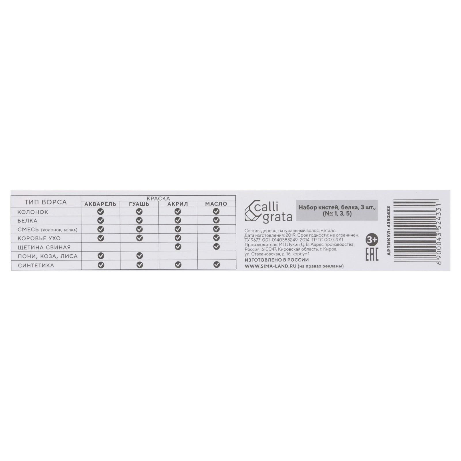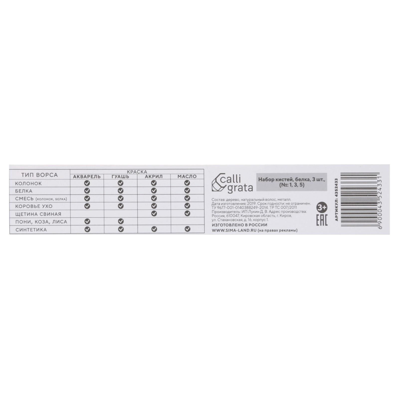 Набор кистей Белка 3 штуки, №1, Calligrata, Россия