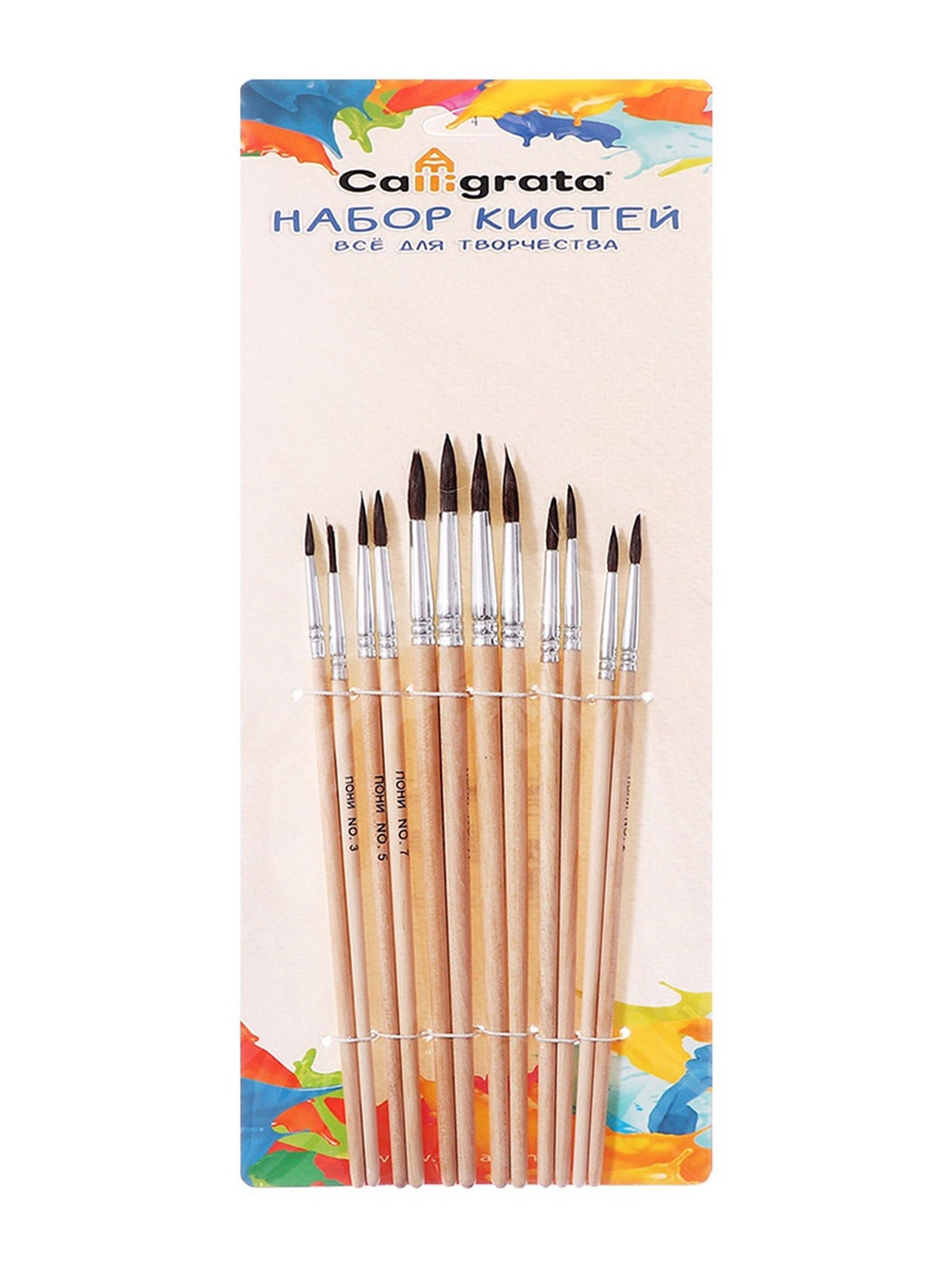 Набор кистей для рисования, пони, 12 штук: № 1, 2, 3, 4, 5, 6, 7, 8, 9, 10, 11, 12, круглые, деревянная ручка, международный размер, Calligrata, Китай