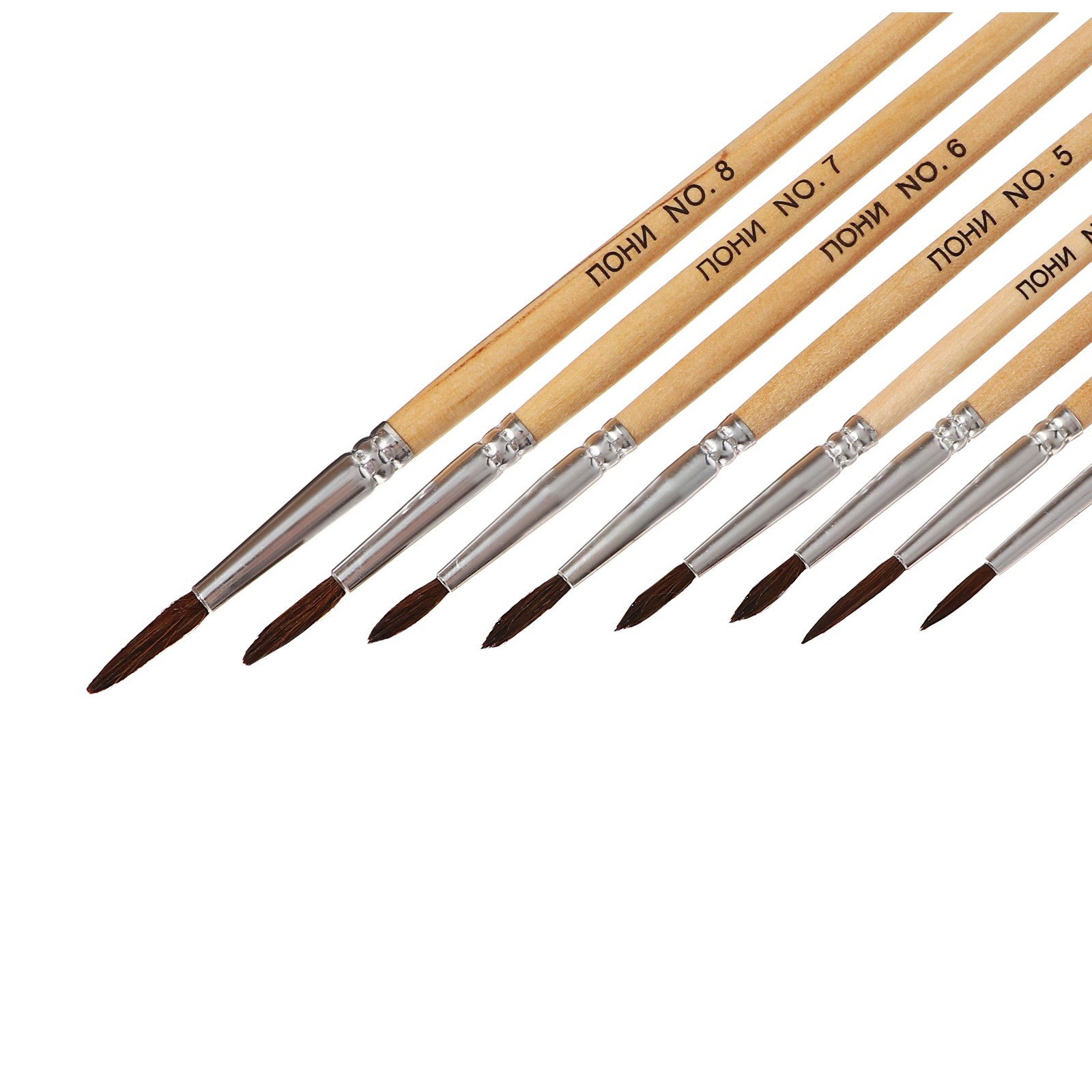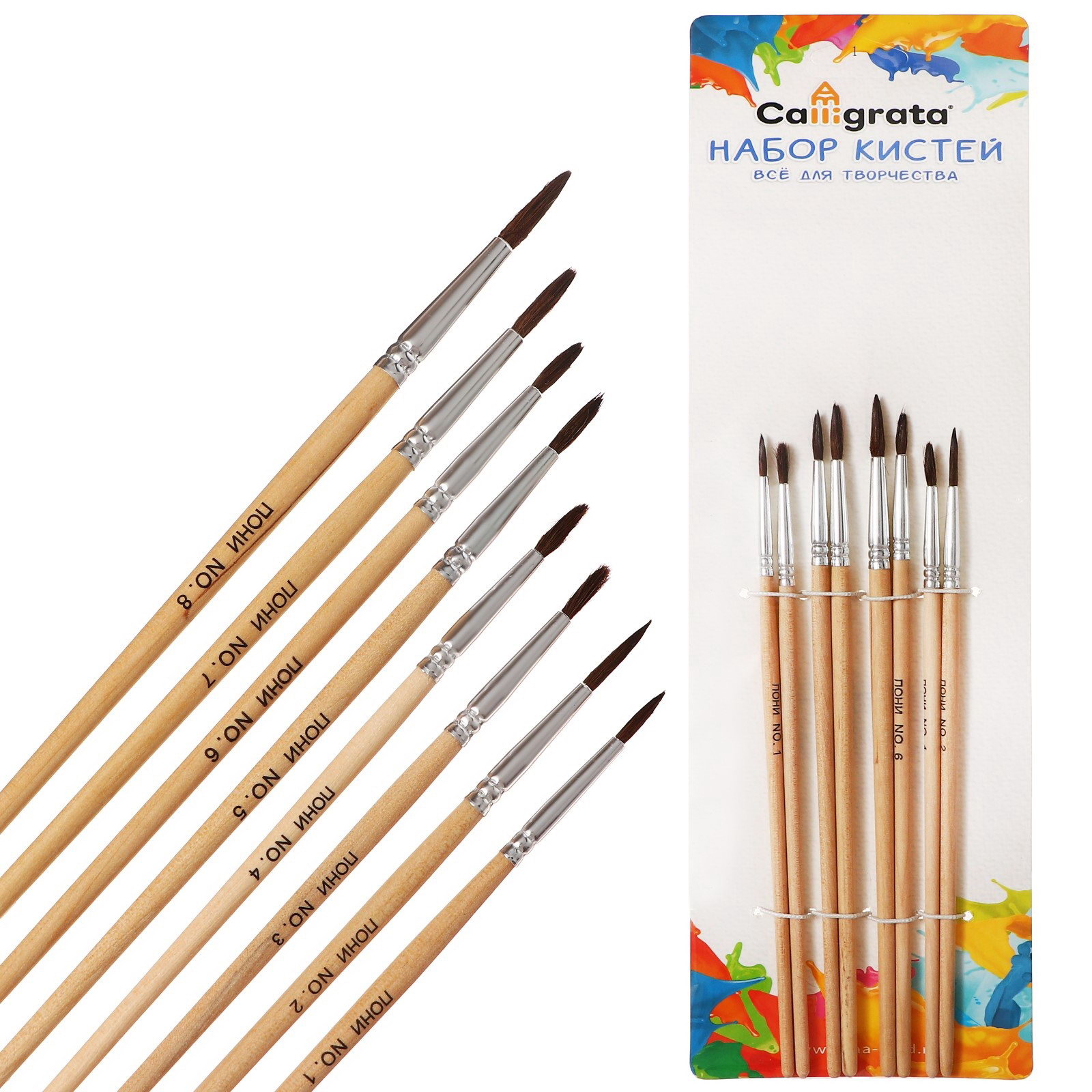 Набор кистей для рисования, пони - синтетика, 8 штук: №1, 2, 3, 4, 5, 6, 7, 8, круглые, деревянная ручка, международный размер, Calligrata, Китай