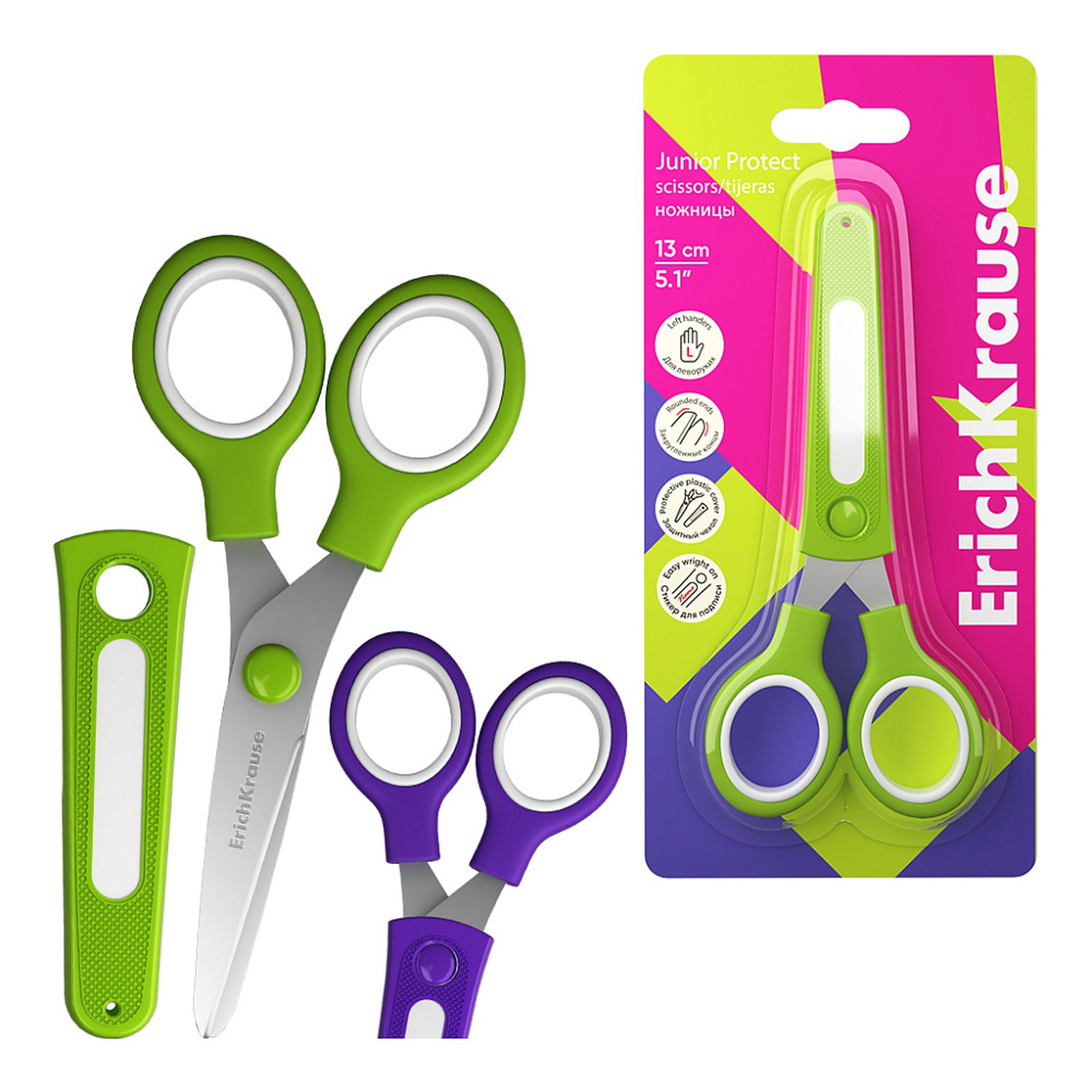 Ножницы 13 см Junior, для левшей, с пластиковым чехол и именным стикером, МИКС, 1.2x9x19 см., ErichKrause, Китай