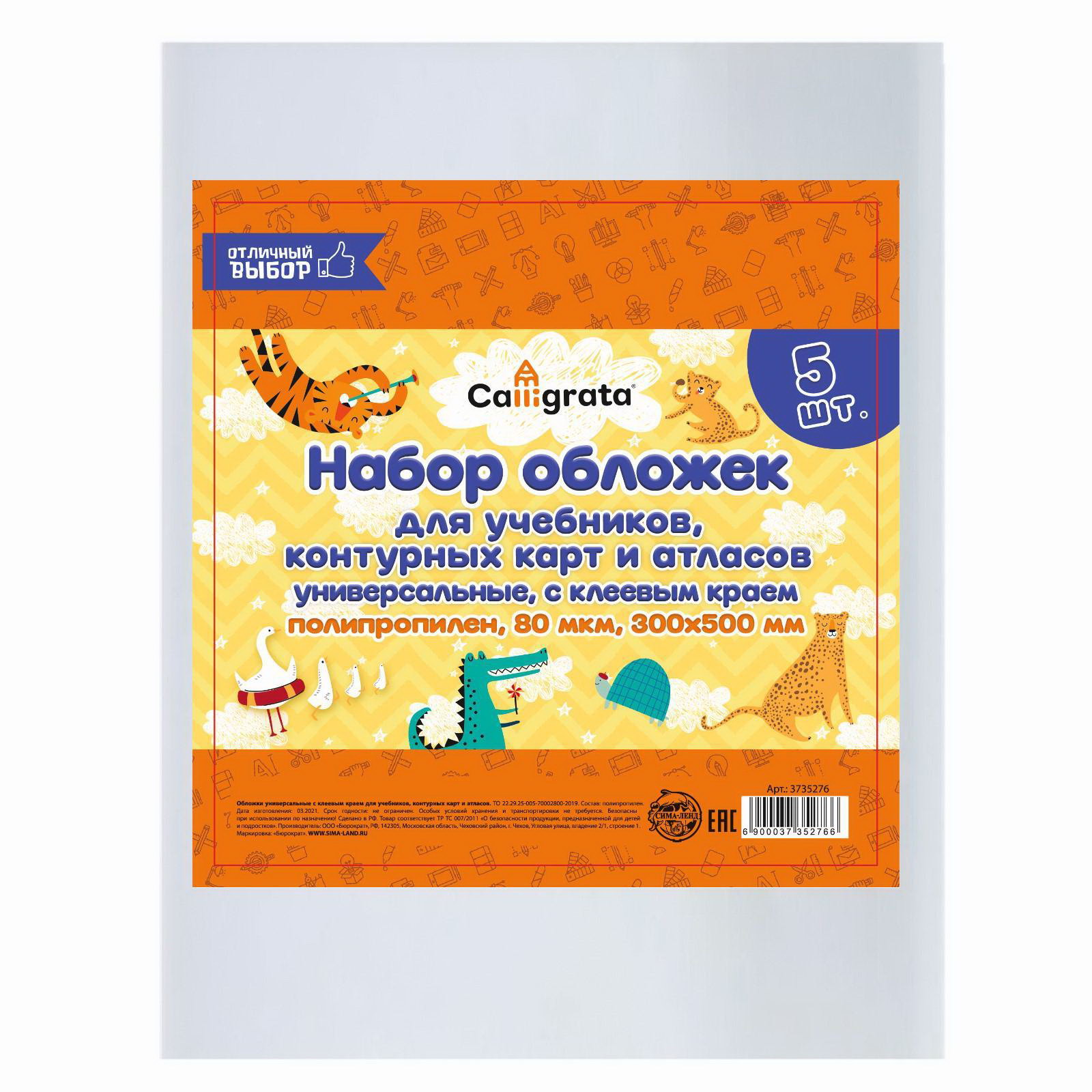 Набор обложек ПП 5 штук, 300x500 мм, 80 мкм, для учебников, тетрадей формата А4, контурных карт и атласов, с клеевым краем, универсальные, Calligrata, Россия