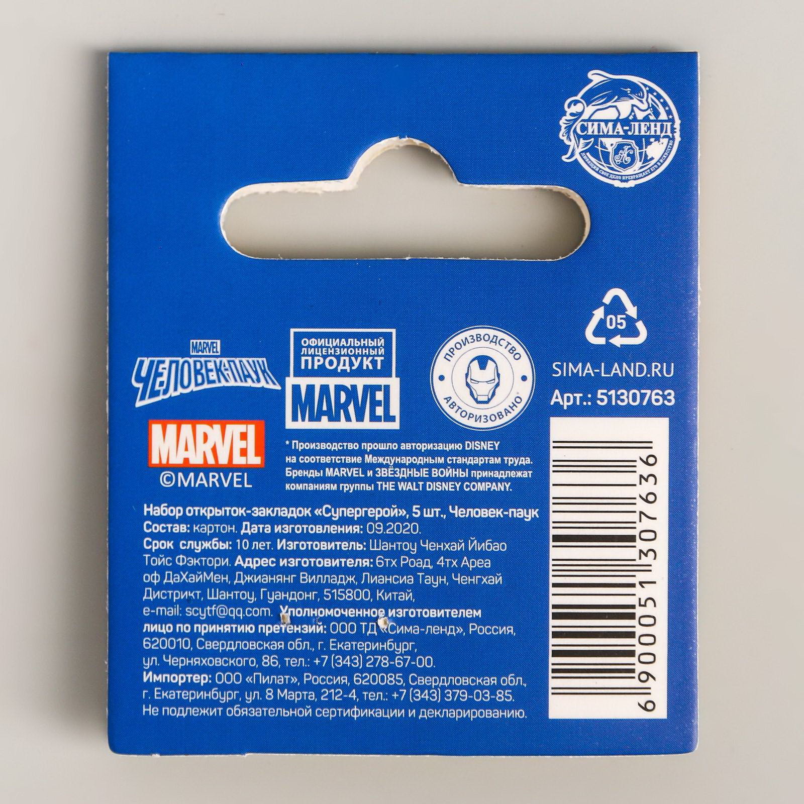 Закладки для книг, фигурные из картона, 5 шт. "Супергерой", Человек-паук, 5x18x0.5 см., MARVEL, Китай